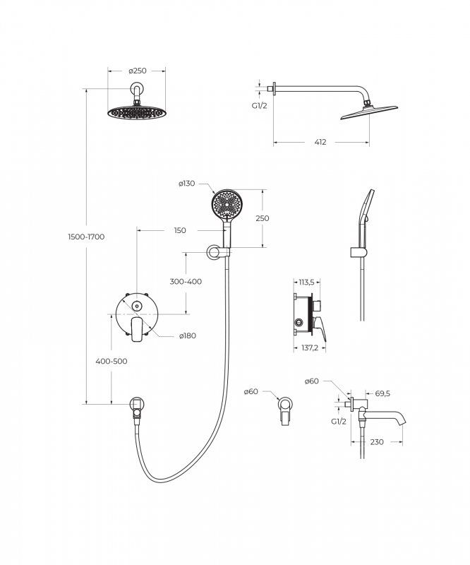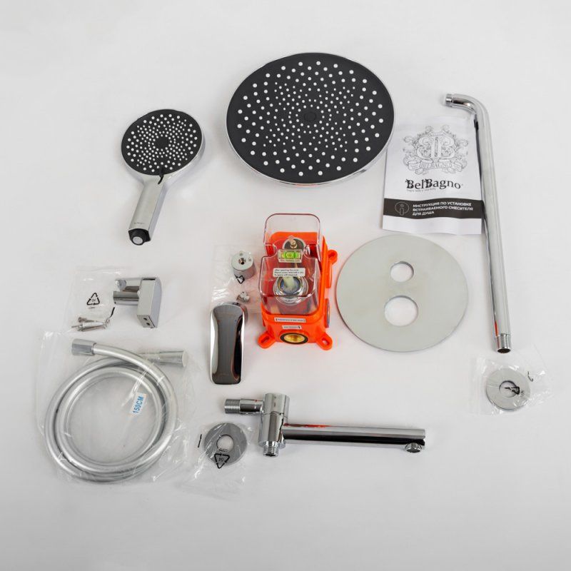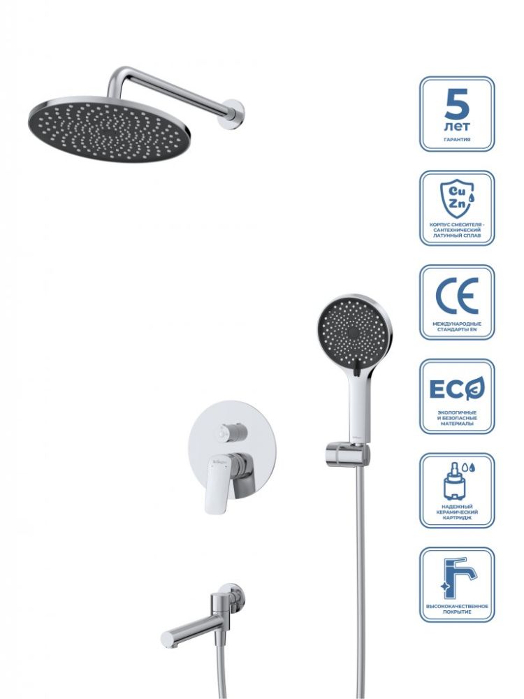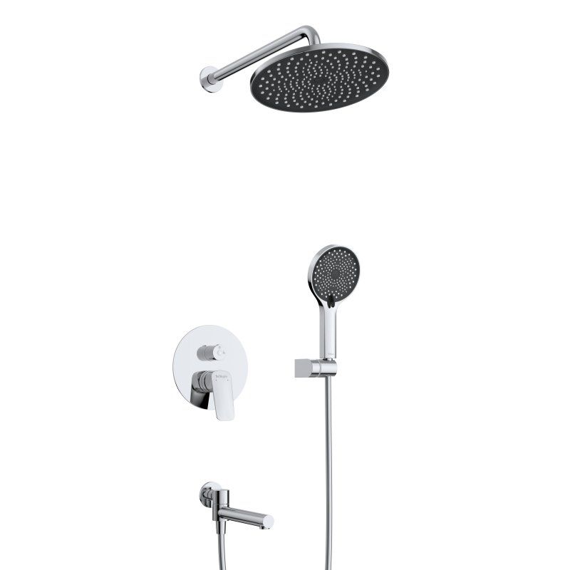 Оснащение: встраиваемый смеситель с переключателем на два выхода, верхний душ с кронштейном, излив для ванны, ручной душ 3-х режимный со шлангом, штуцером и держателем