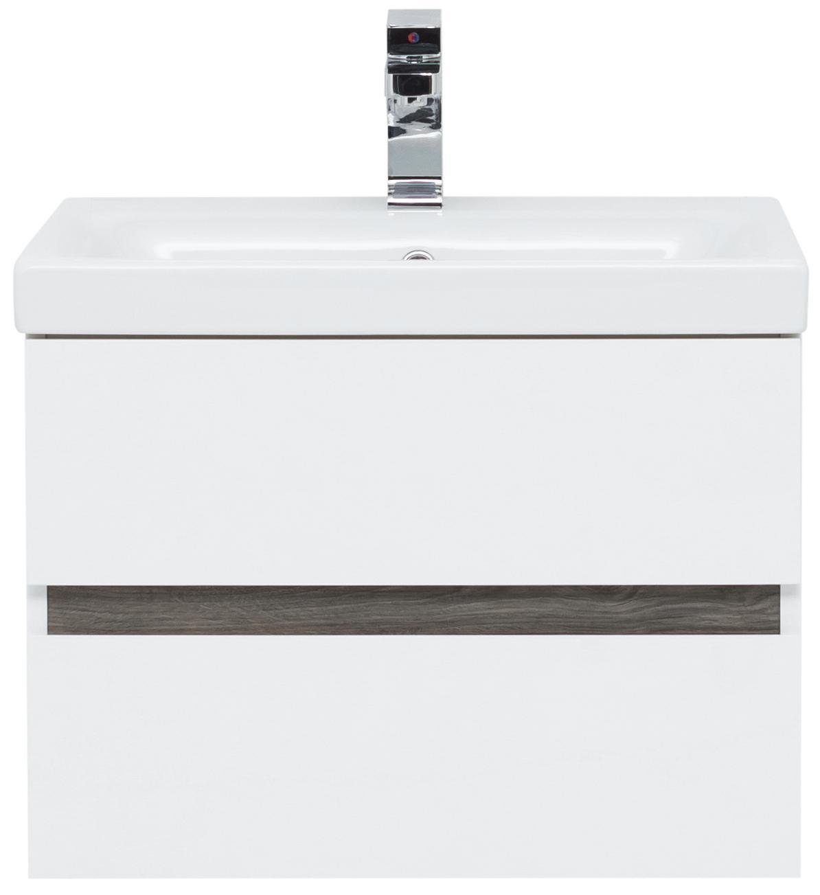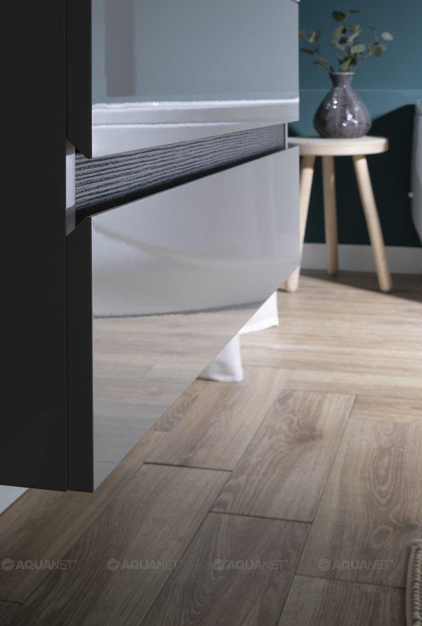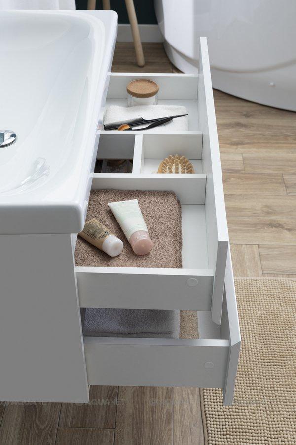 И еще одно важное преимущество: функциональная зона хранения в тумбе шириной 60 см. Она распределена между двумя выдвижными ящиками. Их внутренняя часть выполнена в белом цвете. Верхний ящик – это органайзер, разделенный на три отделения, где удобно хранить мелочи. Нижний более глубокий и позволит сложить полотенца или поставить весь арсенал пеномоющих или гигиенических средств. Ящики оборудованы доводчиками производства германской компании Hettich.
