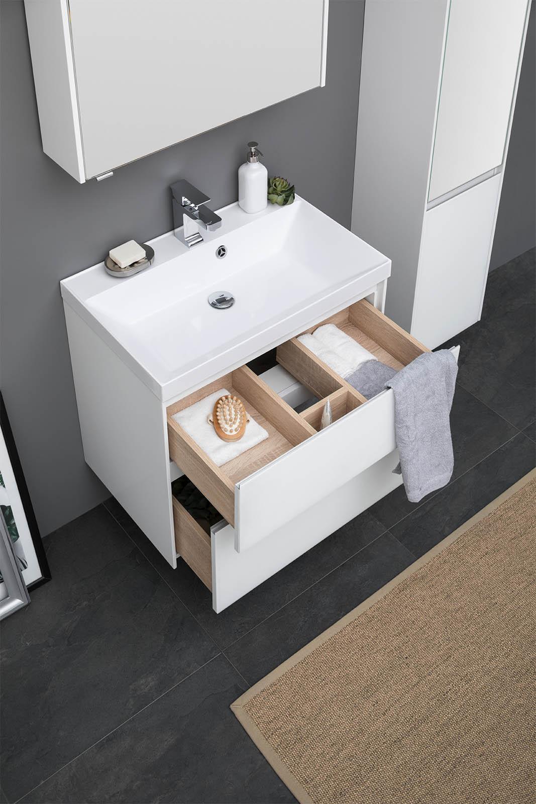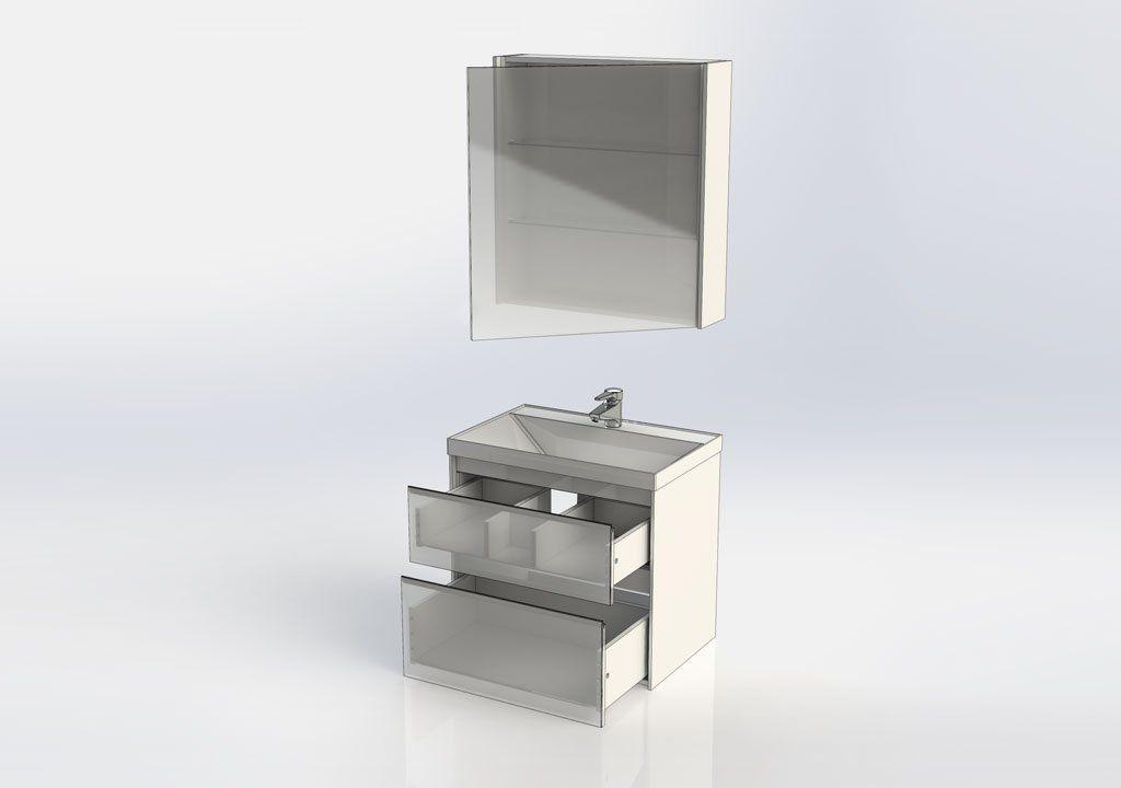 Производители позаботились о деталях. Ящики лишены выступающих деталей, ручки интегрированы в фасад. Тумбу можно из подвесного элемента преобразовать в напольный, просто докупив универсальные ножки. Раковина из литьевого мрамора «Орлеан» относится к числу накладных моделей и внешне выглядит как единое целое с тумбой. Ящики тумб оснащены направляющими Hettich Quadro c плавным закрыванием, более известным нам как доводчик.