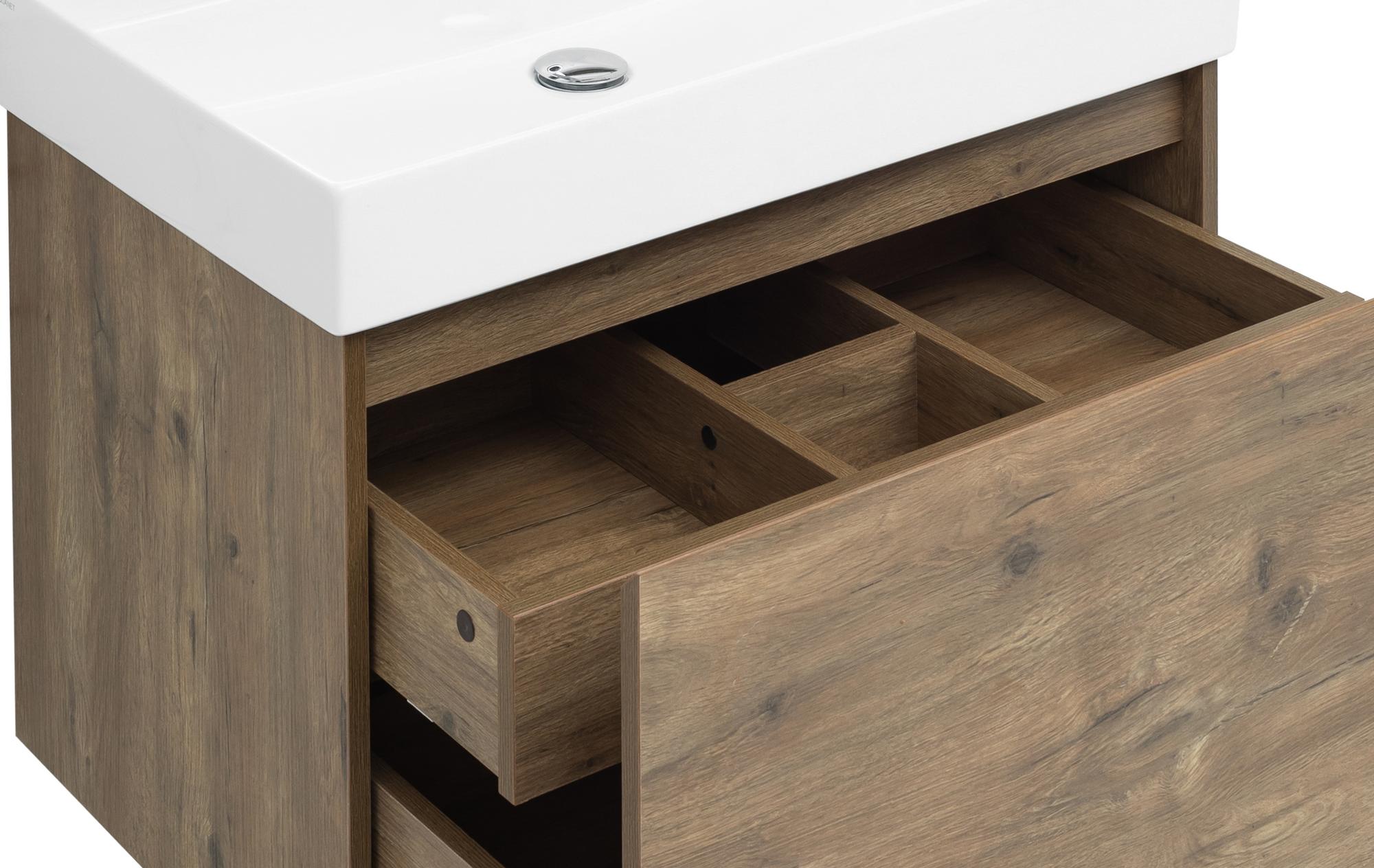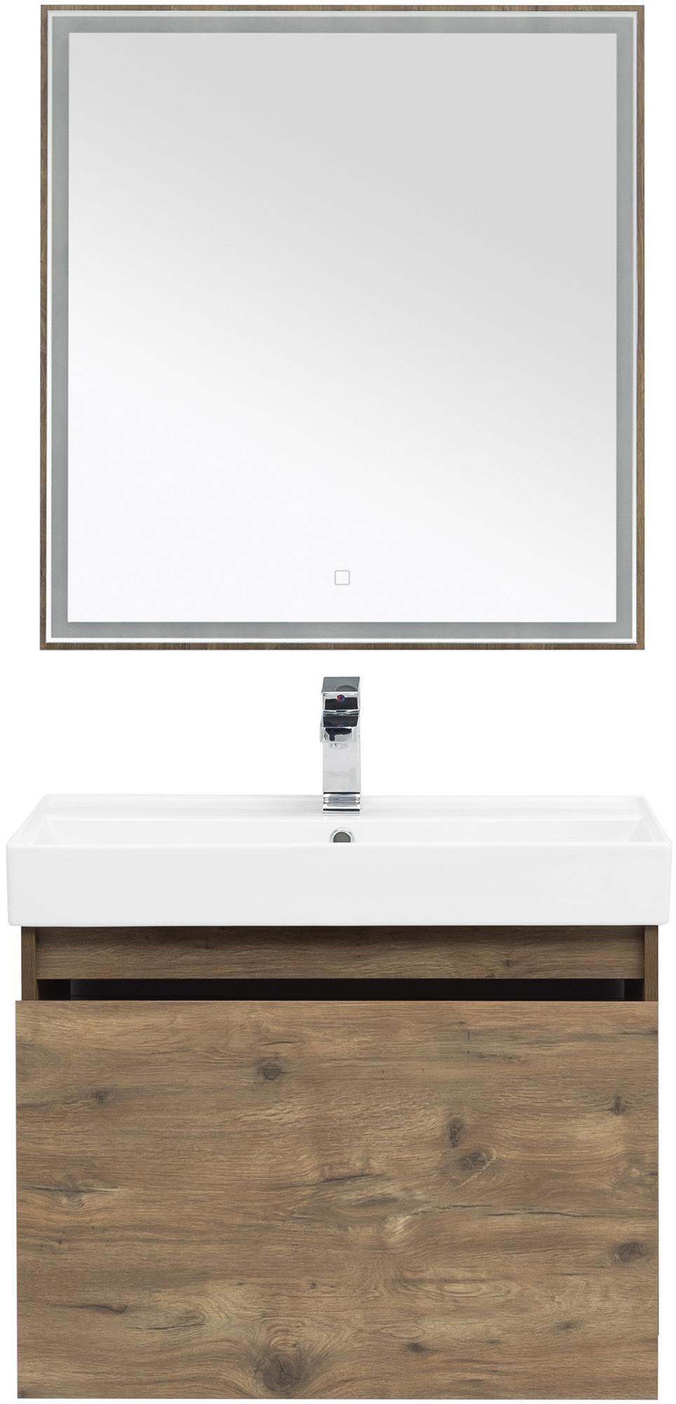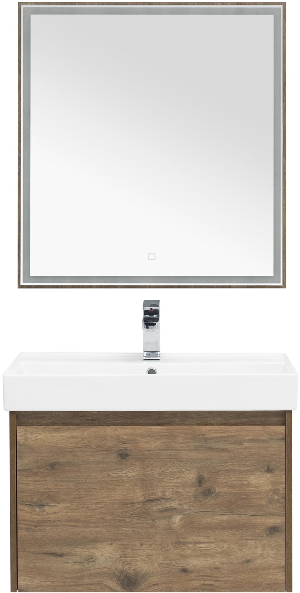 Мебель для ванной Aquanet Nova Lite 75 из влагостойкой ламинированной древесно-стружечной плиты в изысканном цвете «дуб рустикальный» имеет достойный вид. Фактура натурального дерева выглядит благородно, а подвесной монтаж придает визуальную легкость тумбе шириной 75 см. Она оборудована одним ящиком, при открывании которого обнаруживается еще один небольшой для мелочей. Фасад выполнен с декоративной интегрированной ручкой, не имеющей острых краев и внутренних углов, что обеспечивает удобство в эксплуатации и легкий уход за мебелью. Ящики комплектуются направляющими немецкого производства Hettich Quadro, оснащенными доводчиками. Неглубокая и стильная керамическая раковина «Латина» идеально подходит к тумбе. В комплекте с тумбой идет зеркало с LED-подсветкой по периметру.