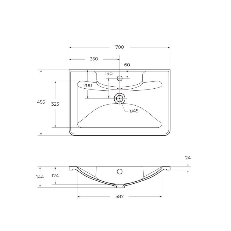 ;C врезными (фрезерованными) ручками в плоскости фасада; раковина сифоном не комплектуется