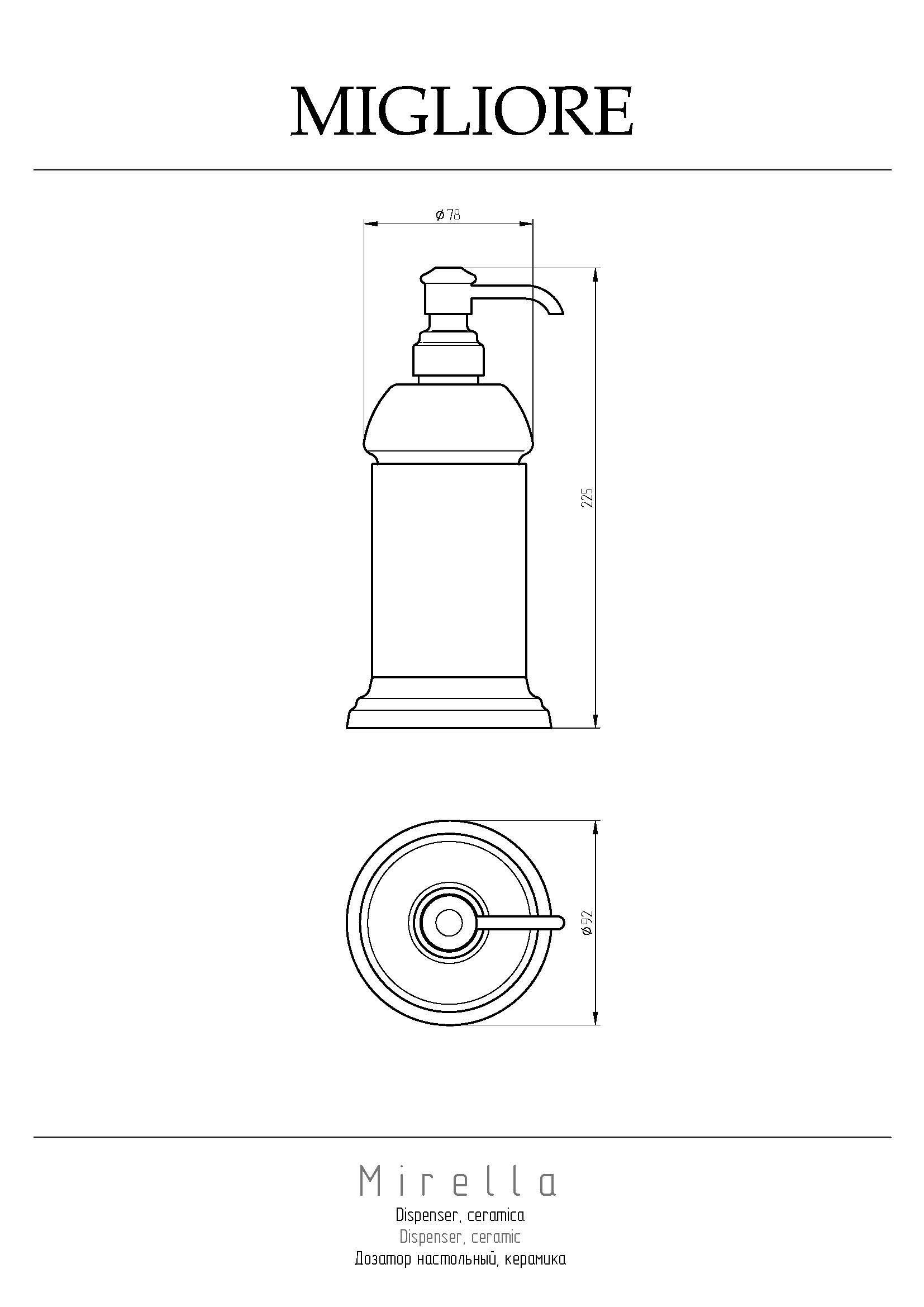 Дозатор настольный серии MIRELLA брэнда MIGLIORE — это незаменимый аксессуар в ванной комнате. Дозатор выполнен из высококачественной керамики, материал держателя — латунь, покрытие цвета бронза. Внимание: бронзовое покрытие достаточно деликатное и для ухода рекомендуется протирать изделие мягкой безворсовой тряпочкой с мыльным раствором и вытирать насухо или использовать чистящее средство Migliore для смесителей и аксессуаров с деликатным покрытием бронза, золото, медь.