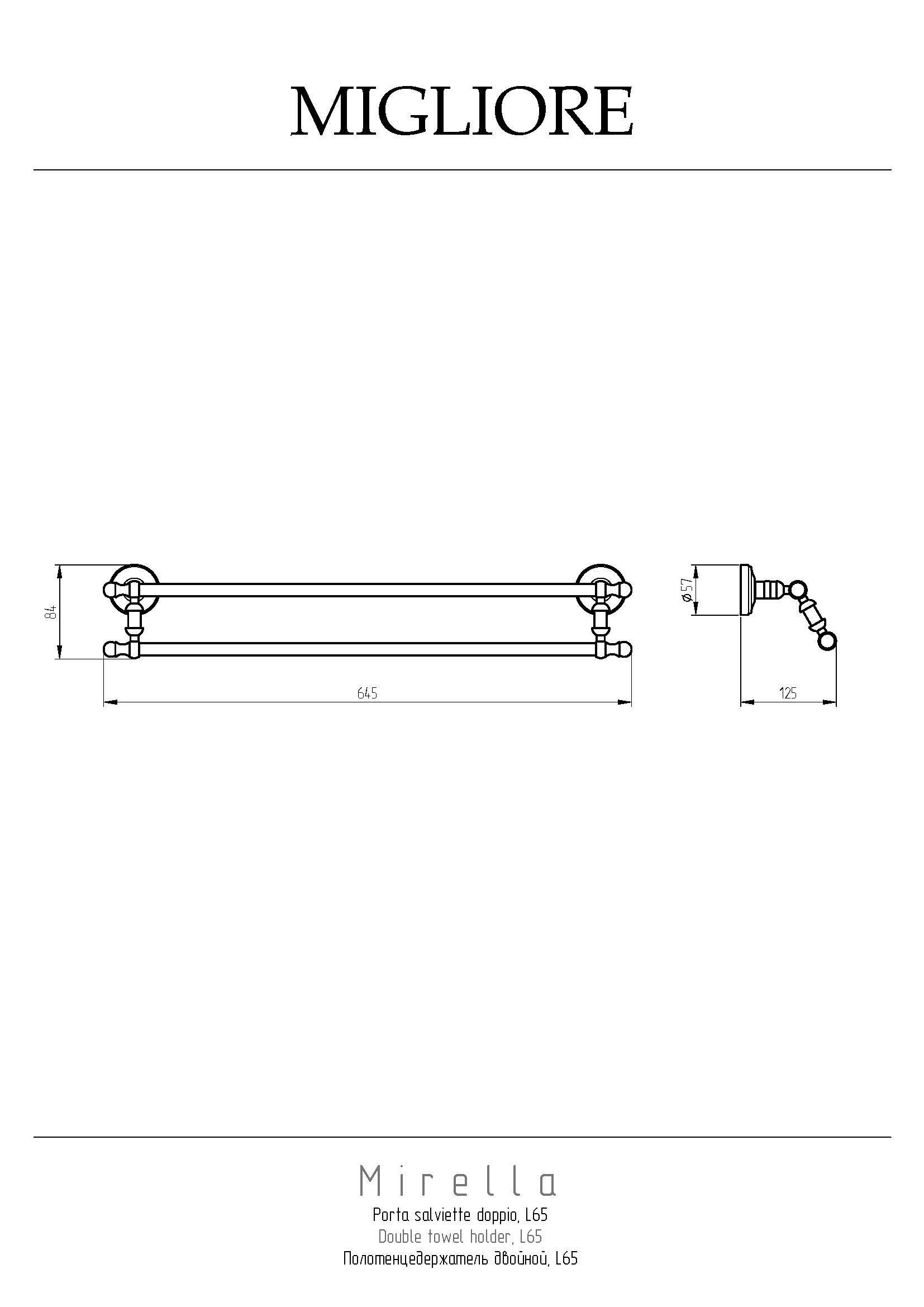 Полотенцедержатель серии MIRELLA бренда MIGLIORE - функциональный аксессуар для ванной комнаты. Его длина 62 см подходит для любого полотенца для рук, лица или тела. Материал — латунь, покрытие цвета бронза. Внимание: бронзовое покрытие достаточно деликатное и для ухода рекомендуется протирать изделие мягкой безворсовой тряпочкой с мыльным раствором и вытирать насухо или использовать чистящее средство бренда MIGLIORE для смесителей и аксессуаров с деликатными покрытиями бронза, золото, медь.