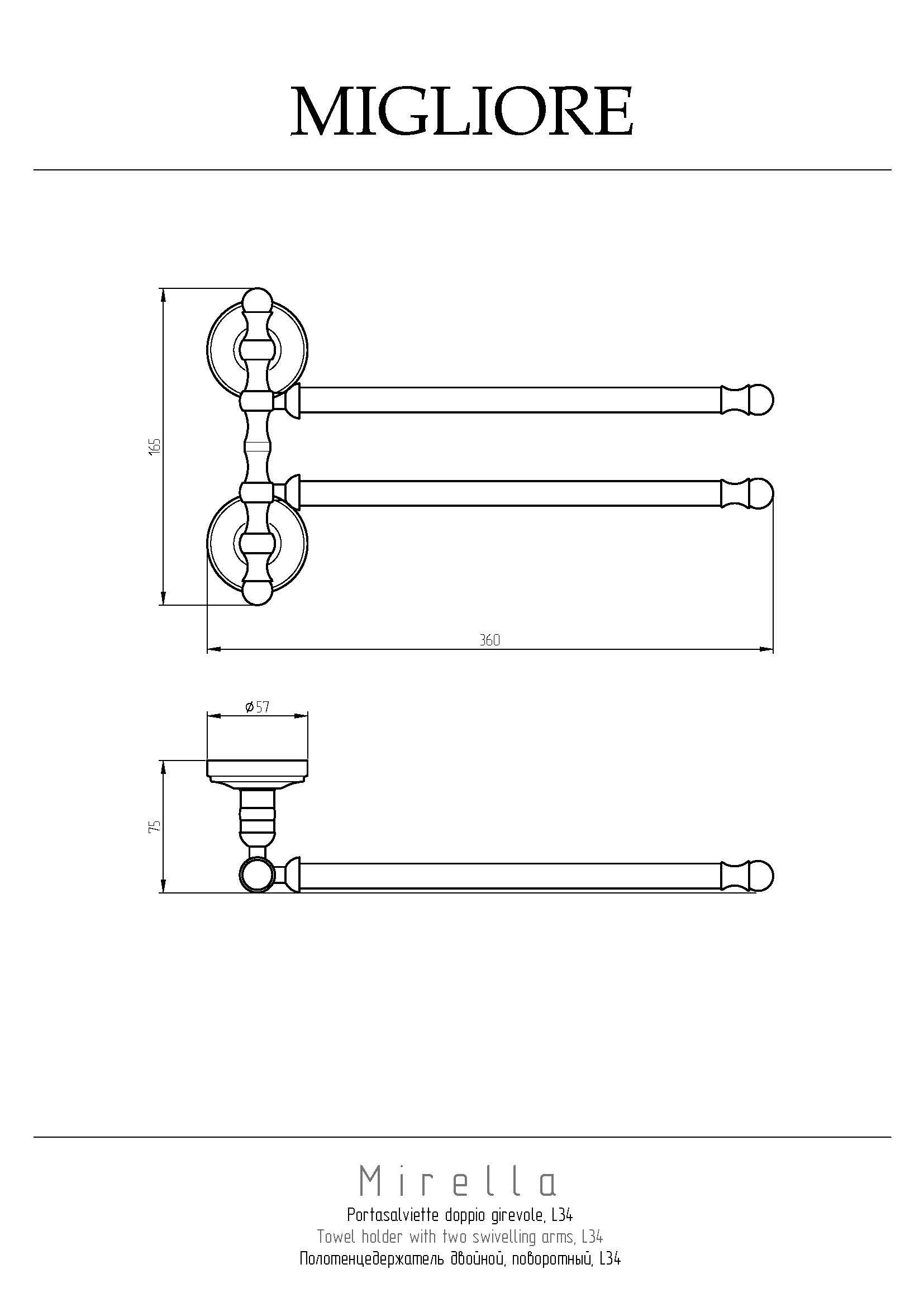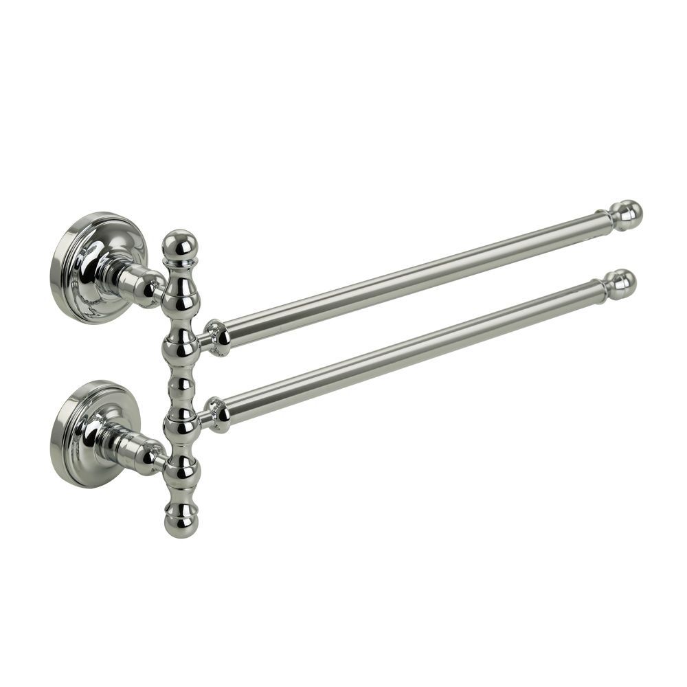 Полотенцедержатель двойной поворотный серии MIRELLA бренда MIGLIORE длиной 34 см очень удобен в использовании. Чтобы повесить его достаточно небольшого пространства, и вы можете развернуть его держатели в одну или другую сторону в зависимости от наличия места на стене. Изделие выполнено из латуни и имеет высококачественное хромо-никелиевое покрытие, которое при правильном уходе надолго сохранит свой блеск. Рекомендуется использовать чистящее средство бренда MIGLIORE для смесителей и аксессуаров с хромированным покрытием.