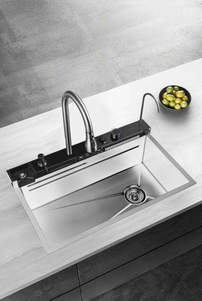 фронтальный душ; водопад; встроенный кран для питьевой воды, индикация температуры и времени работы; амбиентная подстветка.