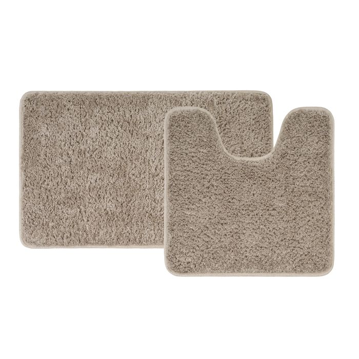 Набор из двух мягких ковриков для ванной светло-коричневого цвета с плотным высоким ворсом (2 см), очень приятных на ощупь. Стриженый ворс из микрофибры отлично держит форму, легко чистится и быстро сохнет. Коврики предназначены для ванной и для туалета (маленький коврик имеет вырез под унитаз).