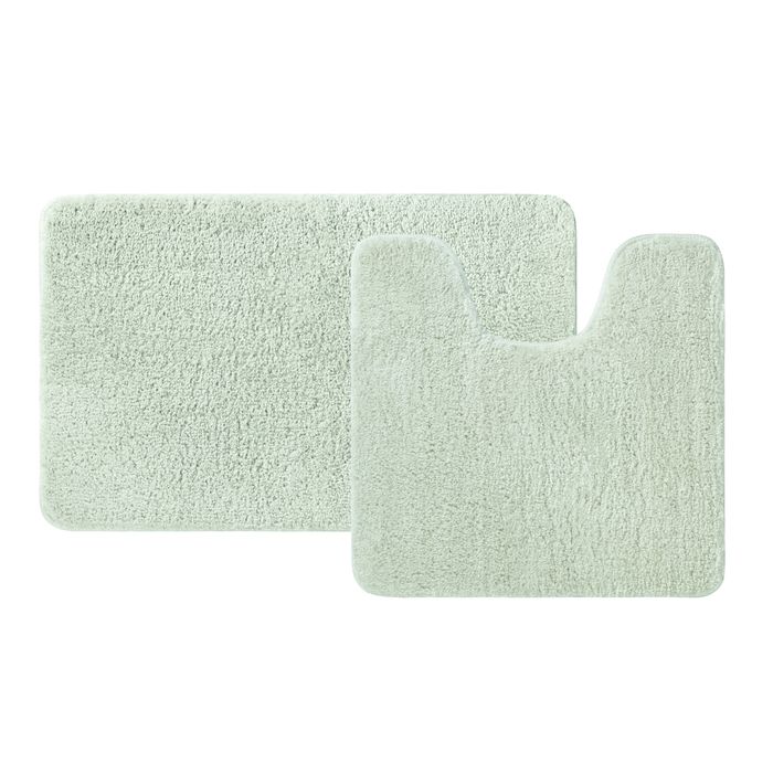 Набор из двух мягких ковриков для ванной светло-зеленого цвета с плотным высоким ворсом (2 см), очень приятных на ощупь. Стриженый ворс из микрофибры отлично держит форму, легко чистится и быстро сохнет. Коврики предназначены для ванной и для туалета (маленький коврик имеет вырез под унитаз).