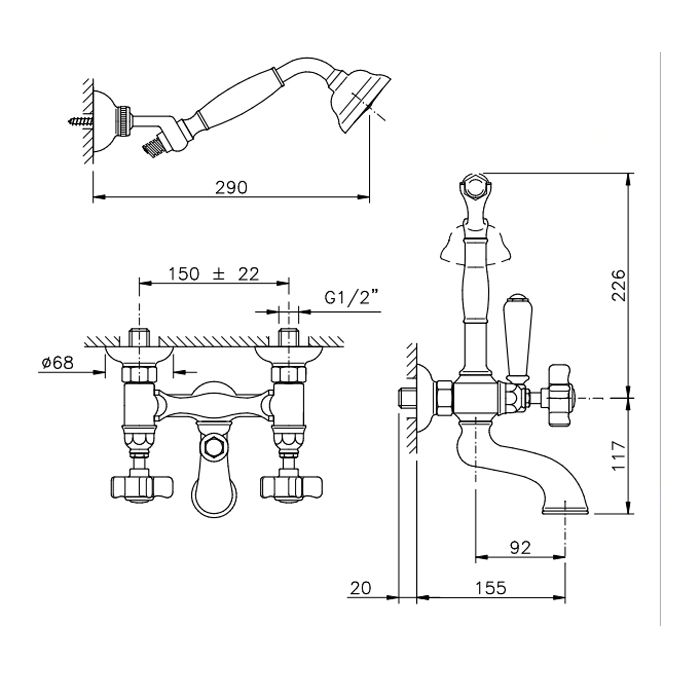 —Nicolazzi Dames Anglaises Смеситель настенный для ванны с 2мя ручками, с переключателем ванна/душ, + комплект руч. душа, цвет: Bronze Plated