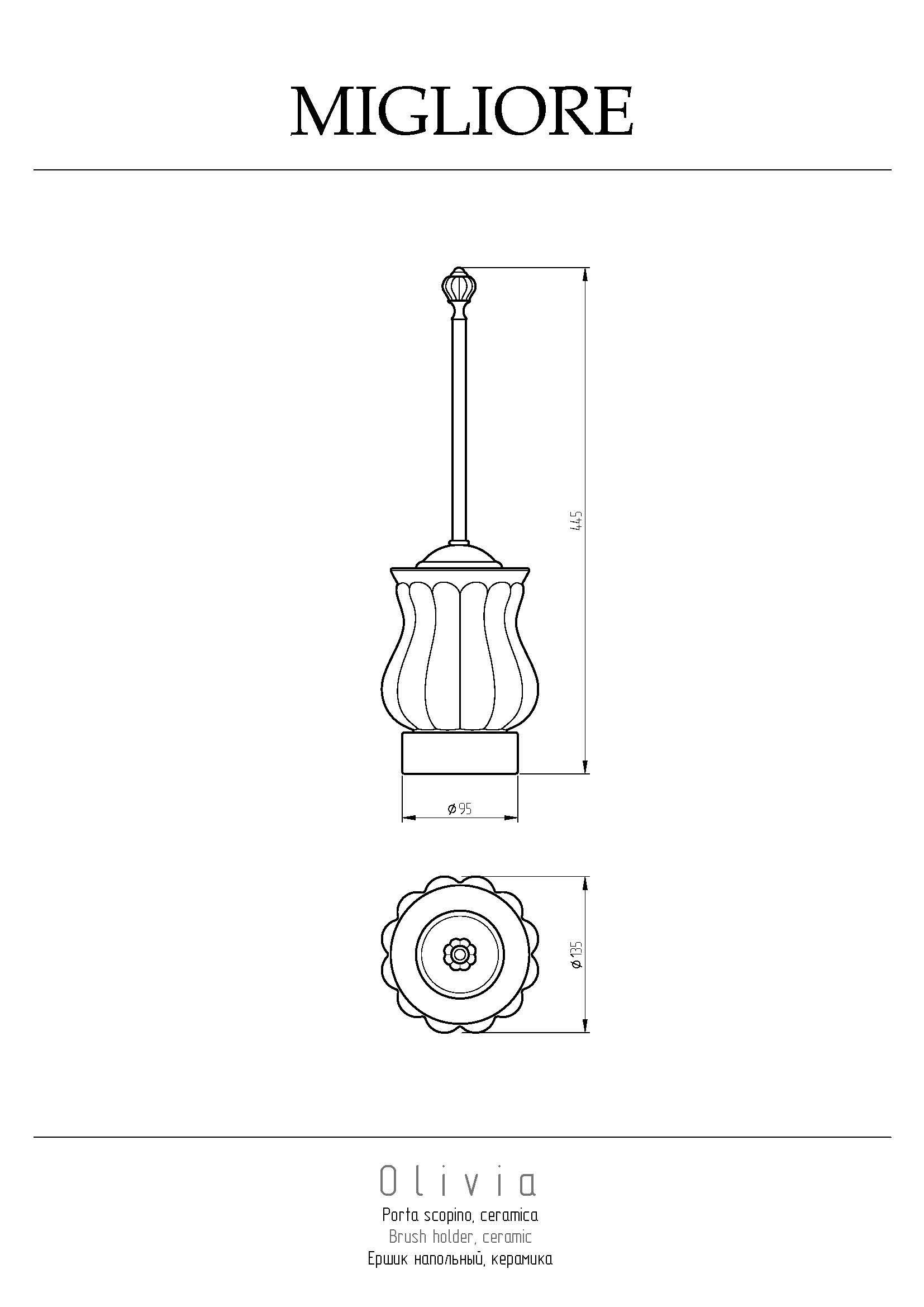Напольный ершик коллекции OLIVIA бренда MIGLIORE - это функциональный аксессуар для ванной комнаты. Керамическая колба выглядит красиво и эстетично, ее легко мыть.