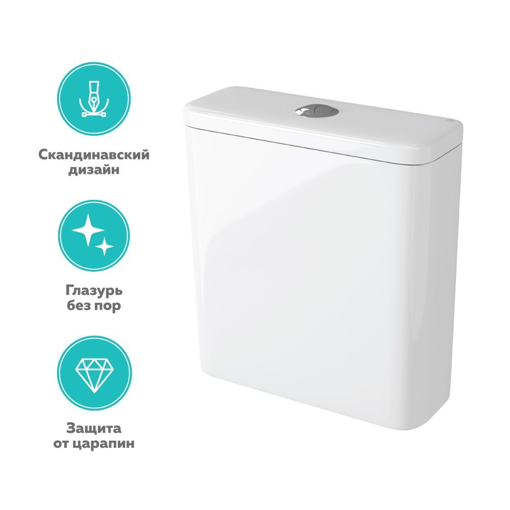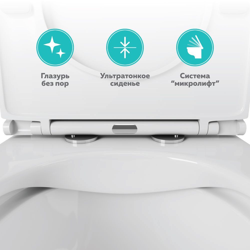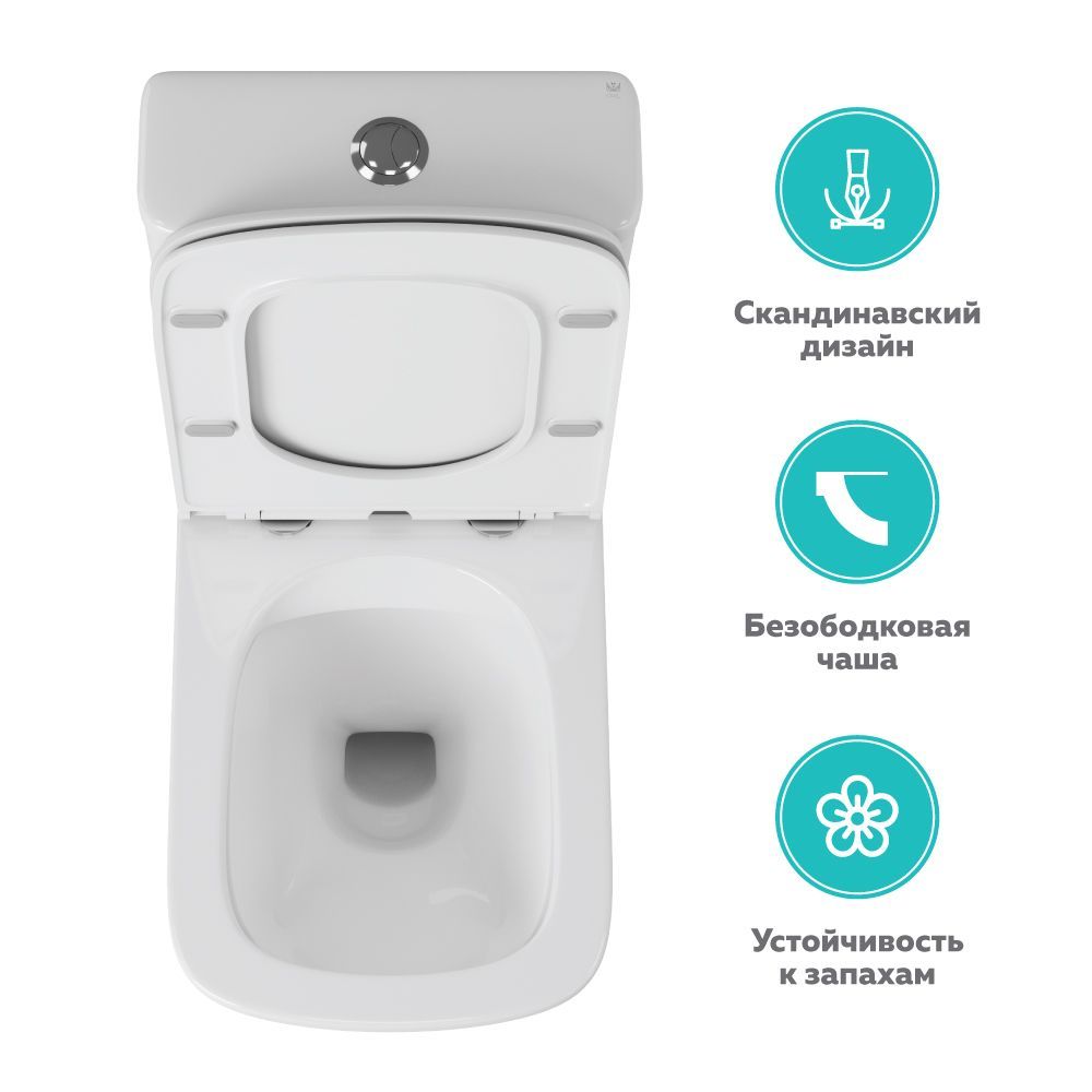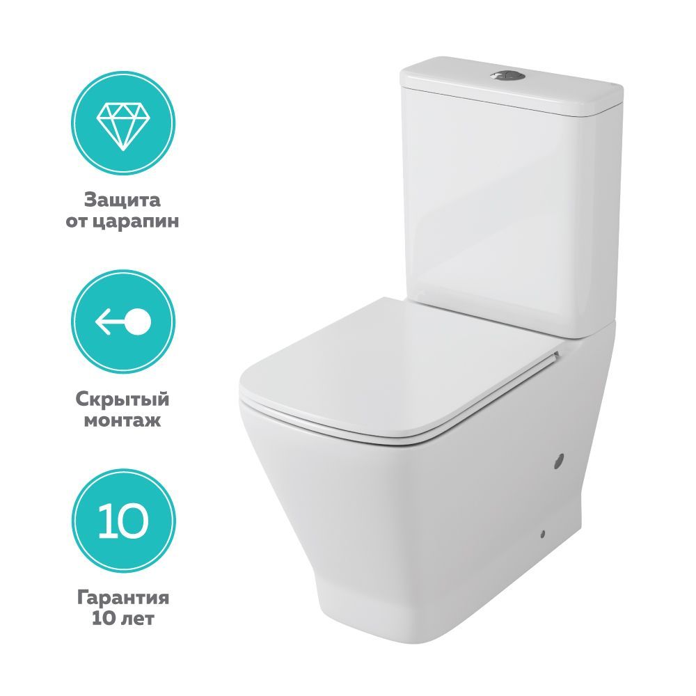 Безободковый (Rimless) унитаз-компакт. Надёжная водосливная арматура WDI. Глазурь полностью закрывающая поры в керамике позволяет сделать процесс очистки изделия проще, а также препятствует образованию налёта. Антибактериальное покрытие препятствующее размножению микроогранизмов. Универсальный выпуск. Мощный вихревой слив (Технология Orkan). Универсальный подвод воды, в том числе, скрытый. Быстросъемное сиденье, дюропласт, крышка микролифт. Кнопка смыва на 3\6 литров.