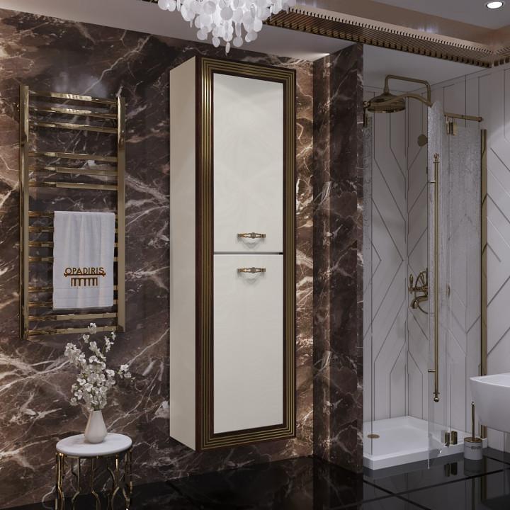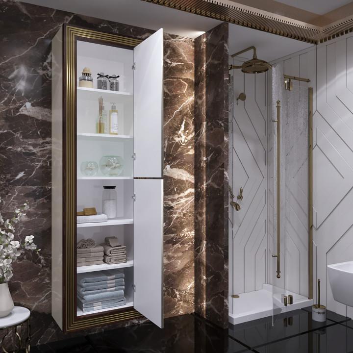 Мебель изготавливается из высококачественного МДФ, окрашенного глянцевыми эмалями бежевого и белого цветов и массива дерева в сочетании с золотой и серебряной патиной. Комплект состоит из зеркала в деревянной раме с подсветкой, тумбы с современной раковиной из литьевого мрамора и европейской фурнитуры.
