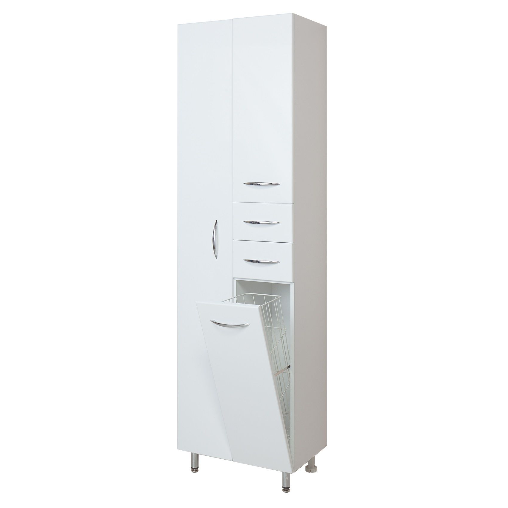 Конструкция пенала предусмотрела огромное пространство для хранения, в котором поместятся все необходимые вещи: слева - большое отделение сверху, небольшой выдвижной ящик посередине и отделение с корзиной для белья снизу , справа - место для хранения халатов. Размер бельевой корзины: 180*240*650. Дверцы оснащены механизмом плавного закрывания, а ящик - направляющими полного выдвижения.