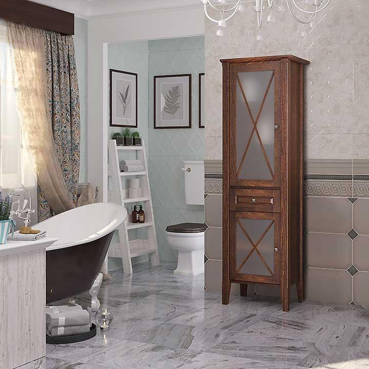 Коллекцию прекрасно дополняет высокий напольный пенал с дверцами с матовым стеклом и выдвижным ящиком.