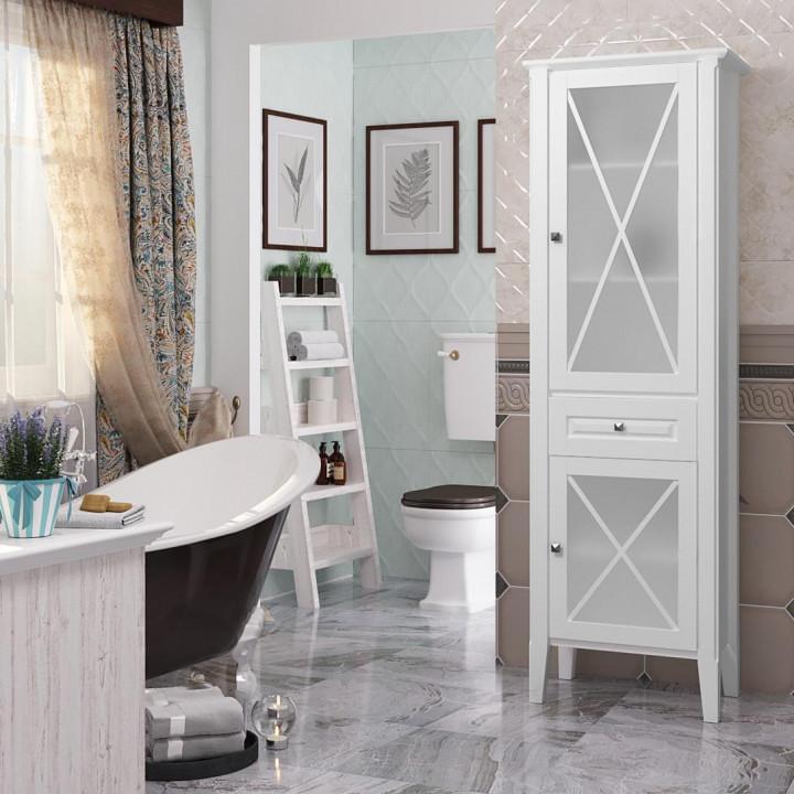 Коллекцию прекрасно дополняет высокий напольный пенал с дверцами с матовым стеклом и выдвижным ящиком.
