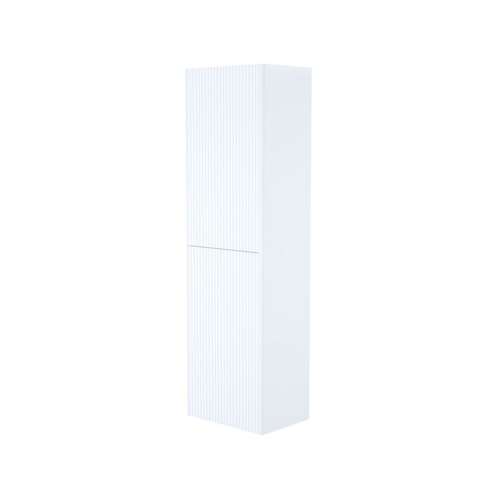 Подвесной пенал для ванной в классическом белом цвете с трендовой вертикальной фрезеровкой дополняет коллекцию мебели Aiger.