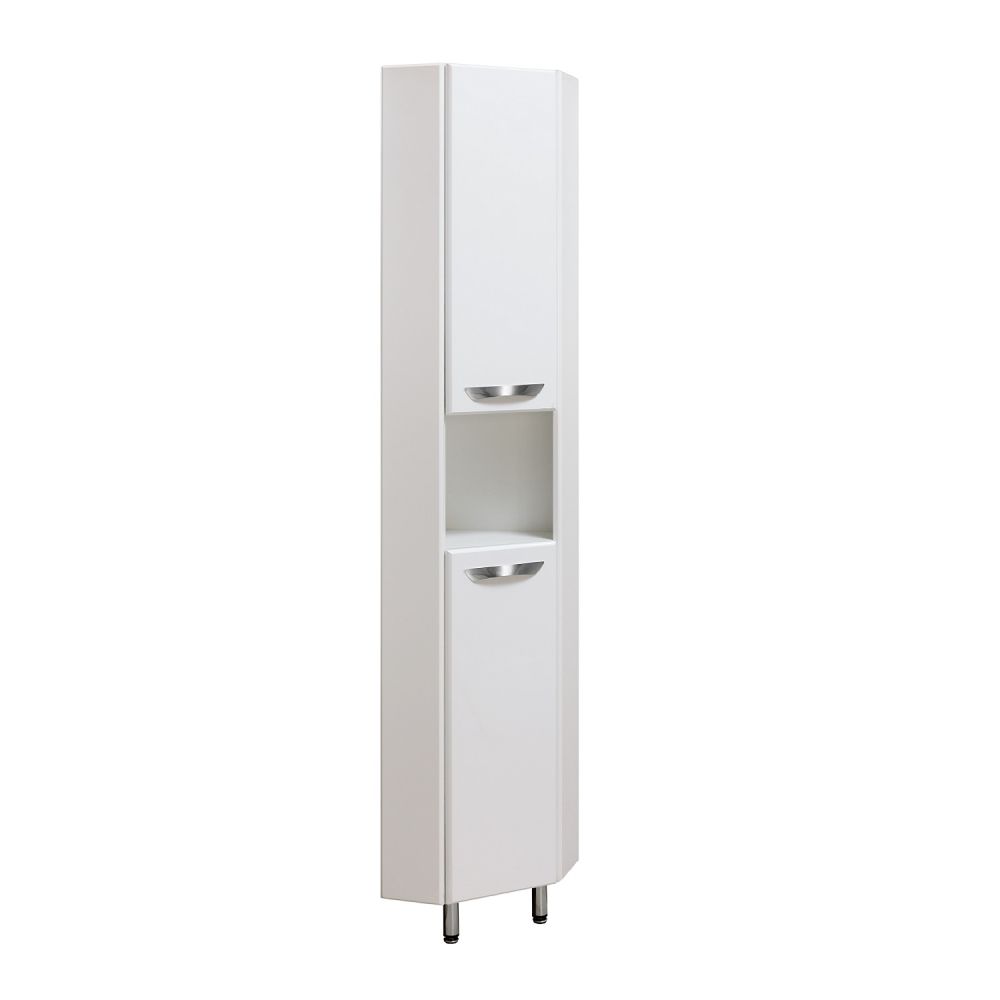 Шкаф-колонна угловой с двумя распашными дверками и открытой нишей посередине. В нижнем и верхнем отделениях - по одной внутренней полке. Петли со встроенным доводчиком, ручки - 2шт, ножки хром - 2 шт, ножка пластик -1шт. Универсальный.