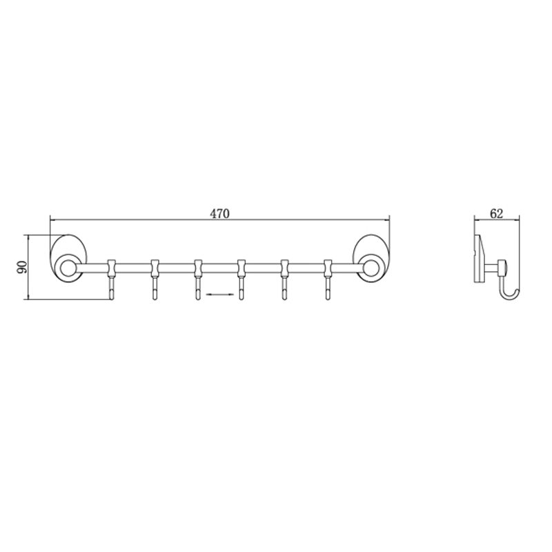 вешалка из 6 подвижных крючков на горизонтальной планке настенного монтажа, L=470 мм