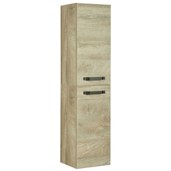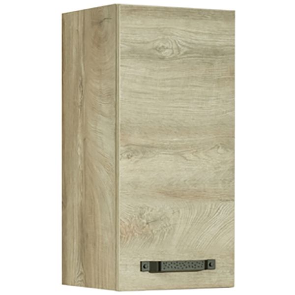 - Внутри шкафчика, выполненного из влагостойкой ламинированной плиты в цвете Дуб Эндгрейн, находится вместительное отделение, разделенное регулируемой по высоте полкой.