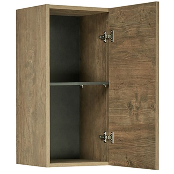 - Внутри шкафчика, выполненного из влагостойкой ламинированной плиты в цвете Дуб Эндгрейн, находится вместительное отделение, разделенное регулируемой по высоте полкой.
