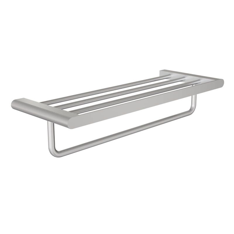 Полка для полотенец в матовой стали сочетает сдержанную элегантность и высокую износостойкость. Такая отделка легко сочетается с любыми сантехническими элементами, создавая гармонию в ванной комнате.