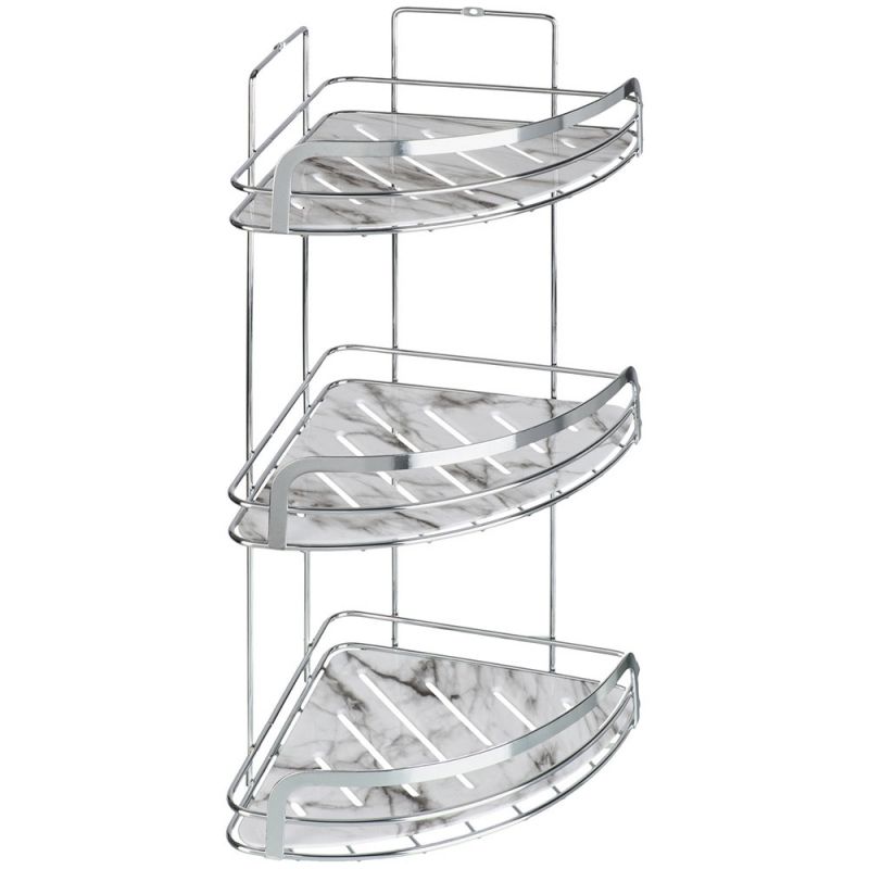 Полка-корзина Fora Marble FOR-MAR03-U тройная, угловая - изделие изготовлено из хромированного железа, устойчивого к появлению коррозии, и имеет пластиковую вставку, имитирующую мрамор. Вставку можно снять, что облегчает уход за изделием.