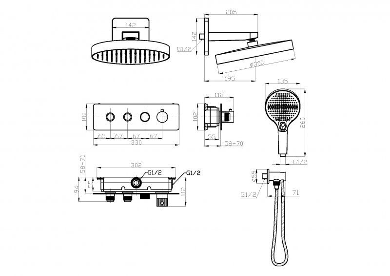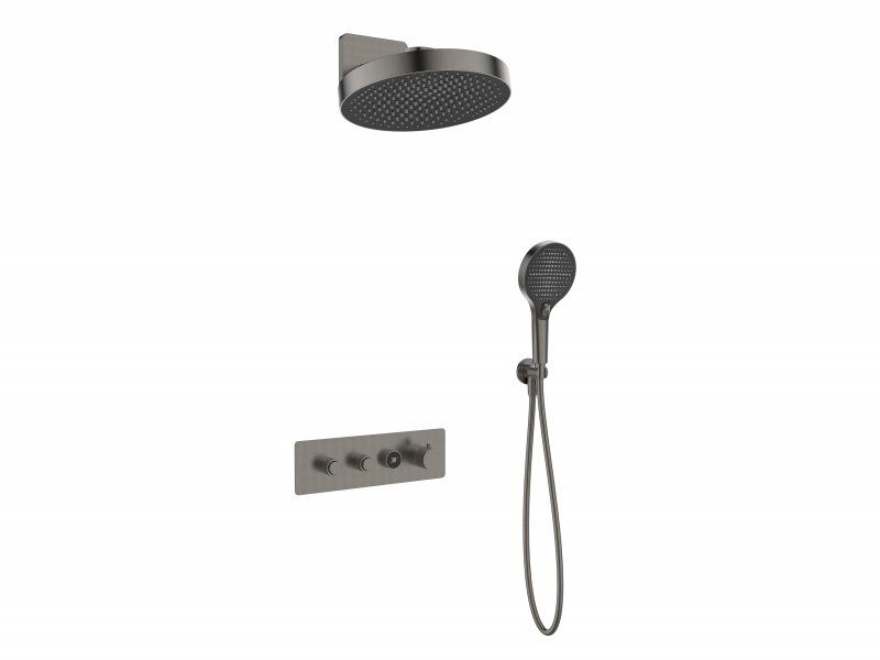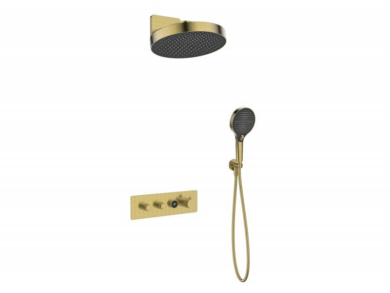 Оснащение: встраиваемый смеситель с термостатом и переключателем на два выхода, верхний душ из ABS с кронштейном, ручной душ 3-х режимный из ABS, душевой шланг 150 см PVC, штуцером с держателем