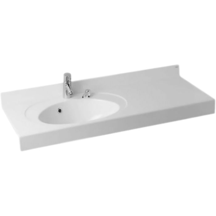 Прямоугольная раковина Акватон Отель 3 120 L 1A70093NOT01L белая, подвесная, с одним готовым отверстием под смеситель, с переливом, с хромированными донным клапаном и врезным дозатором для жидкого мыла.