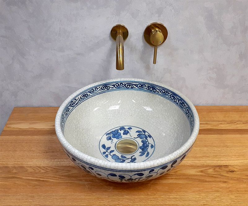 Раковина-чаша Bronze de Luxe Melody 40 2241. Уникальный традиционный орнамент, как нежная восточная мелодия проникает сквозь керамические стенки раковины-чаши Melody. Старинный китайский орнамент в форме цветка хризантемы прекрасно сочетается с традиционным синим цветом и с техникой искусственного состаривания керамики. Техника кракелюра подчеркивает уникальность керамической раковины, подсказывая возможные варианты для дизайна ванной комнаты. Оригинальную керамическую раковину-чашу Melody можно вписать в различные стилистические решения для ванной комнаты: фьюжен, в колониальный или восточный интерьер, в английскую классику.