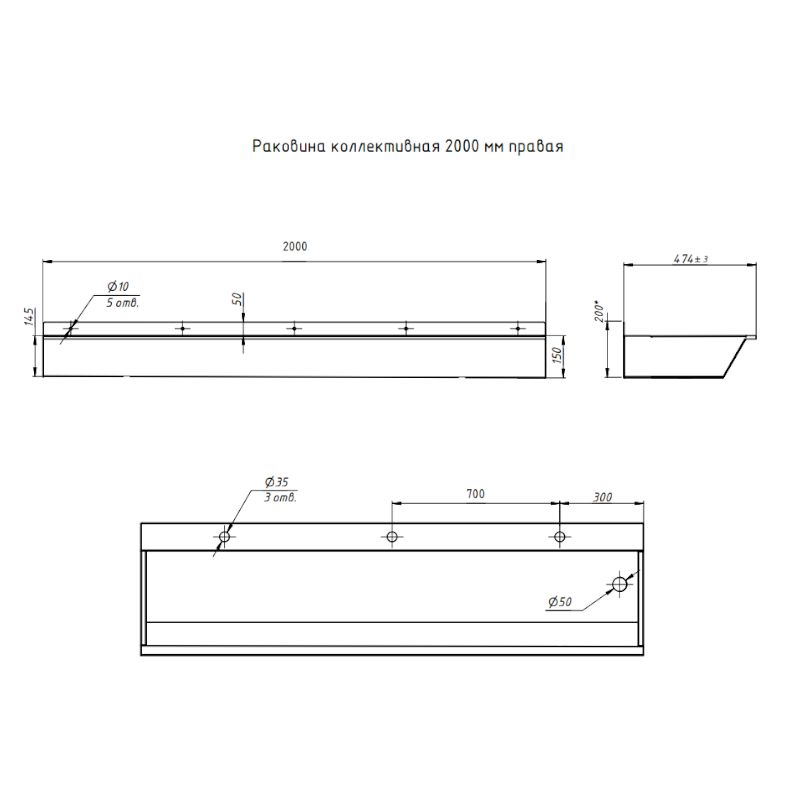 Раковина коллективная L=2,0 м правая. Раковина коллективная, желобковой формы из нержавеющей стали AISI 304. Поверхность раковины шлифованная, матовая. Отверстие слива справа. Толщина стали 1,2 мм.