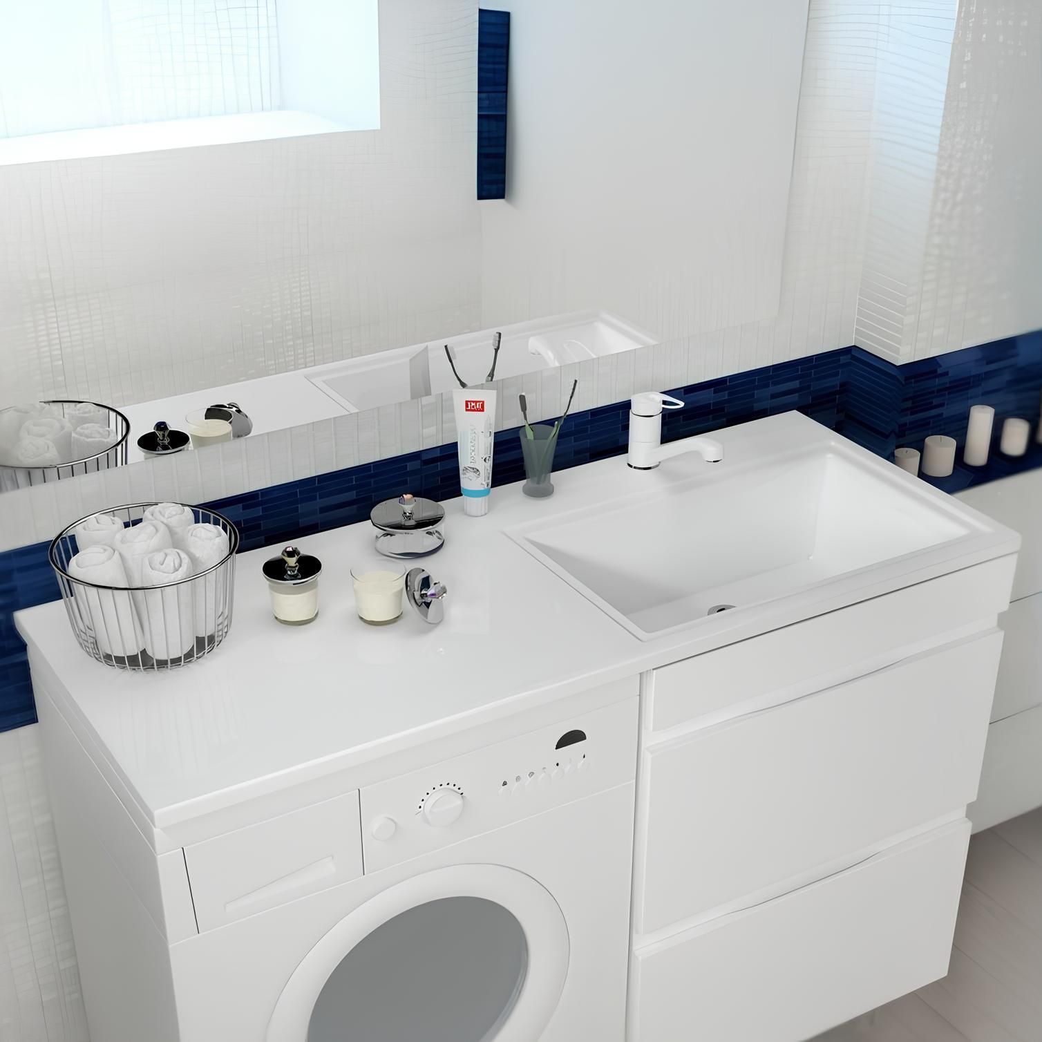 Одно отверстие под смеситель по центру чаши. Подходит к стиральным машинам глубиной до 470 мм.