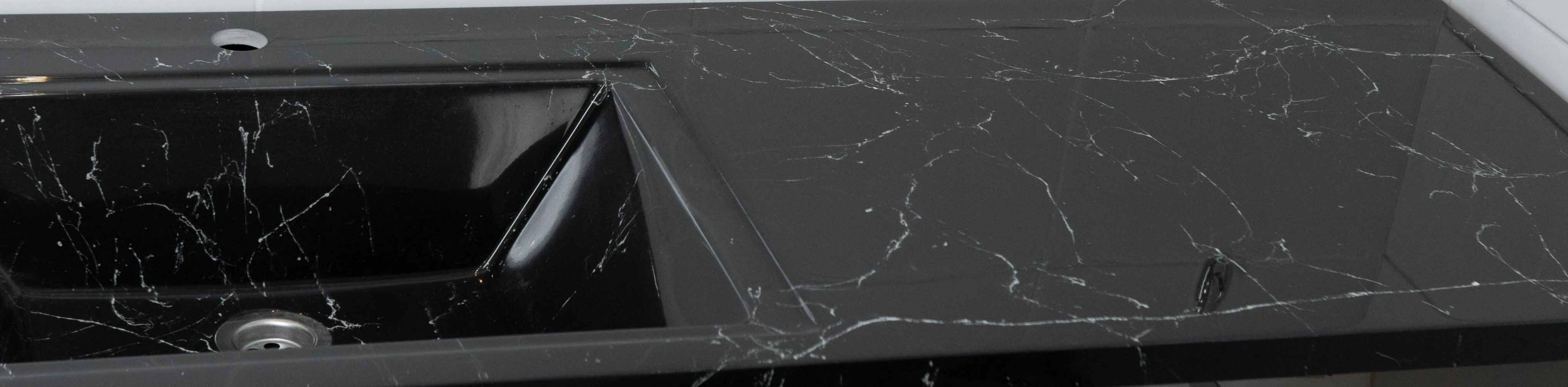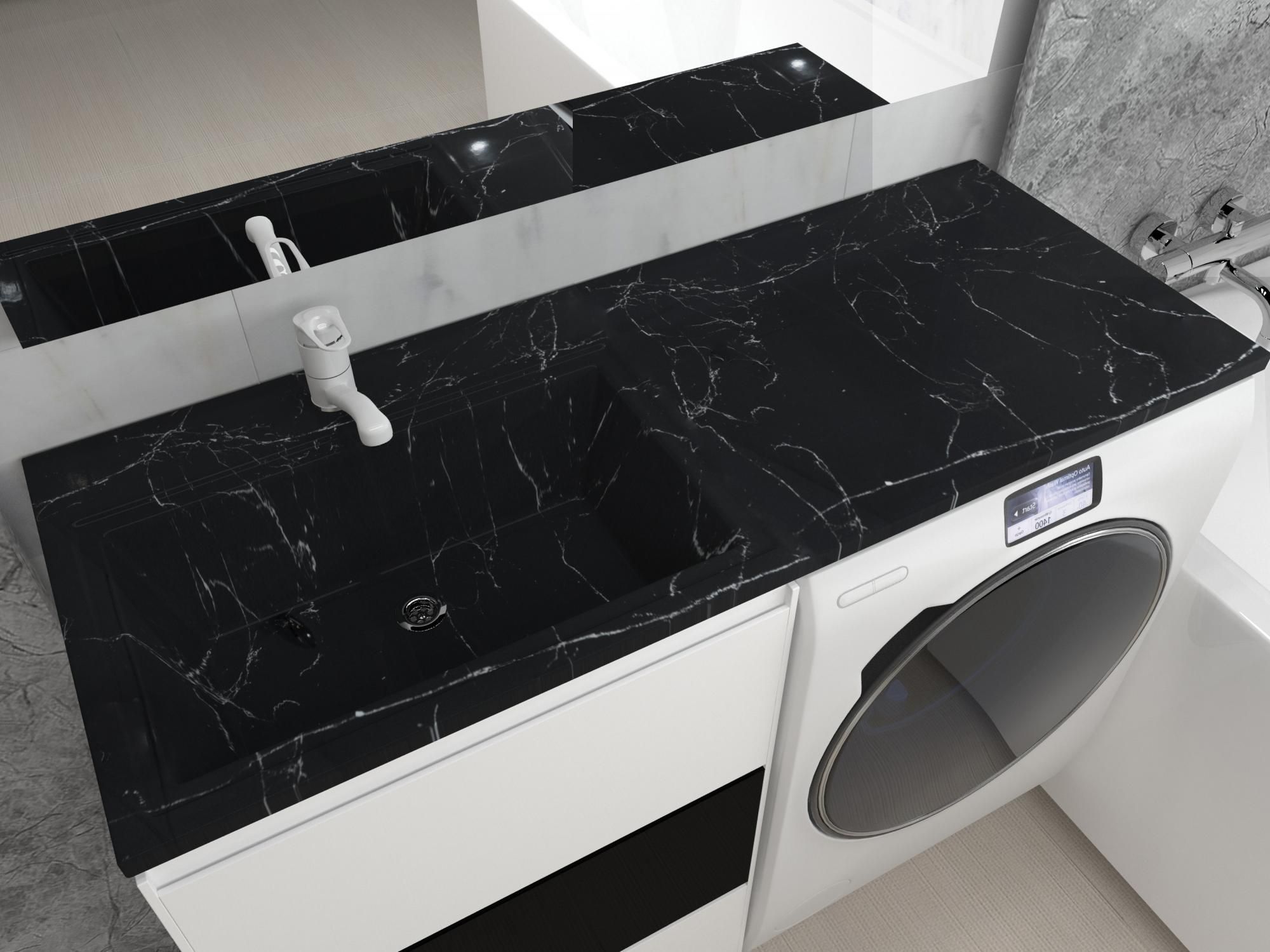 Роскошная раковина черного мрамора для ванной комнаты для установки над стиральной машинкой. Верхний слой гелькоута формирует декоративно защитное покрытие. Раковина крепится на кронштейны. Может эксплуатироваться как самостоятельное изделие, так и со встроенной мебелью. Чаша устанавливается на тумбу или кронштейн, столешница умывальника - на поддерживающий кронштейн. Для крепления раковины на кронштейнах (тумбе) рекомендуется использовать силиконовый либо полеуретановый герметик.