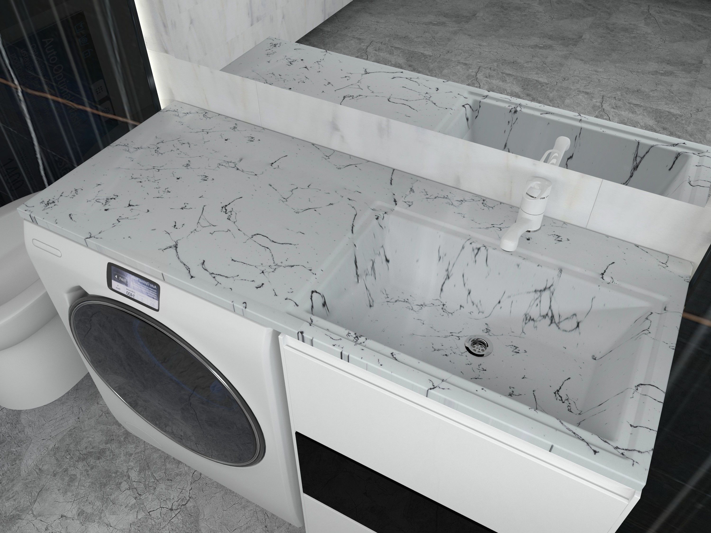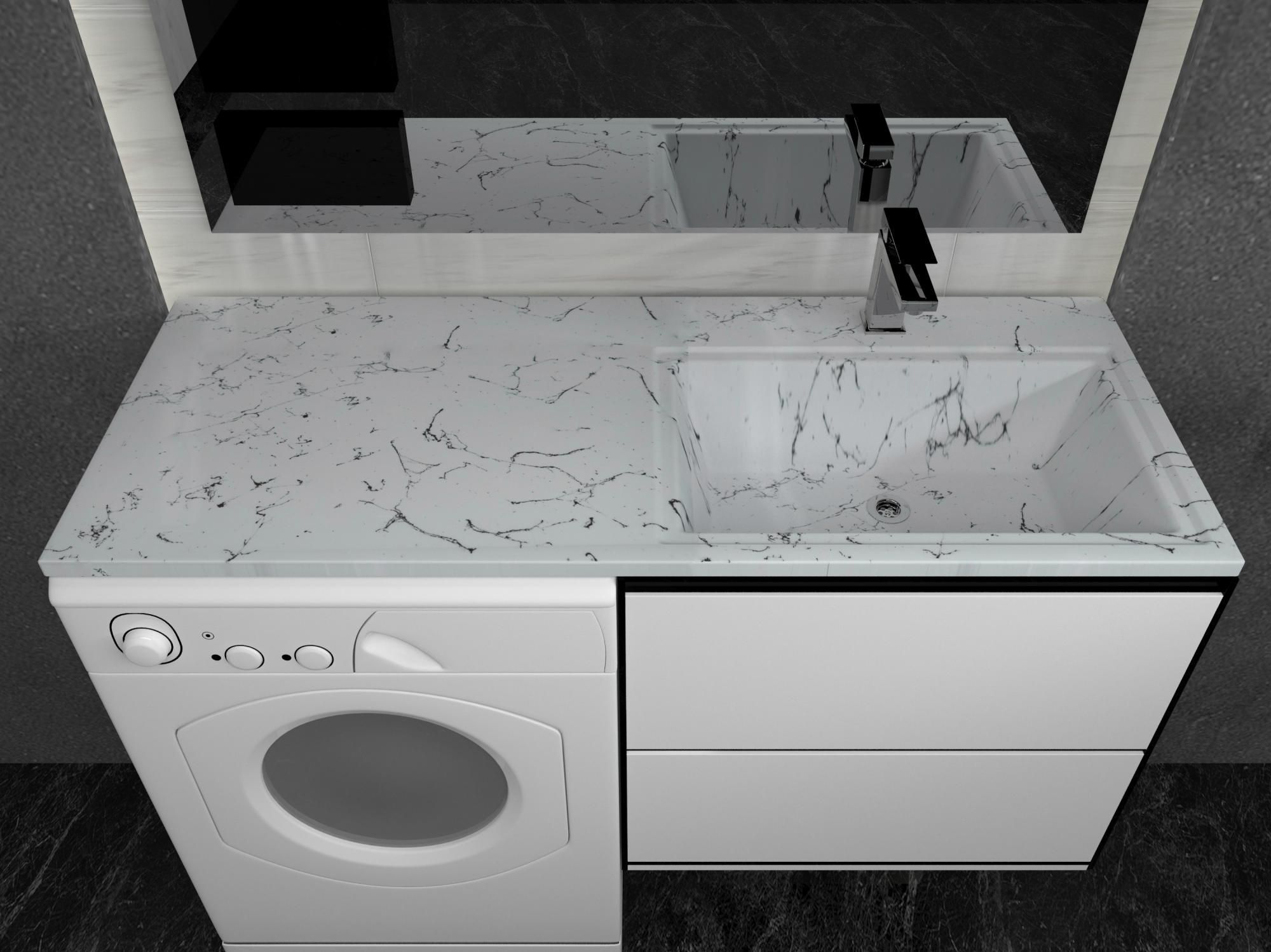 Роскошная раковина белого мрамора для ванной комнаты для установки над стиральной машинкой. Верхний слой гелькоута формирует декоративно защитное покрытие. Раковина крепится на кронштейны. Может эксплуатироваться как самостоятельное изделие, так и со встроенной мебелью. Чаша устанавливается на тумбу или кронштейн, столешница умывальника - на поддерживающий кронштейн. Для крепления раковины на кронштейнах (тумбе) рекомендуется использовать силиконовый либо полеуретановый герметик.