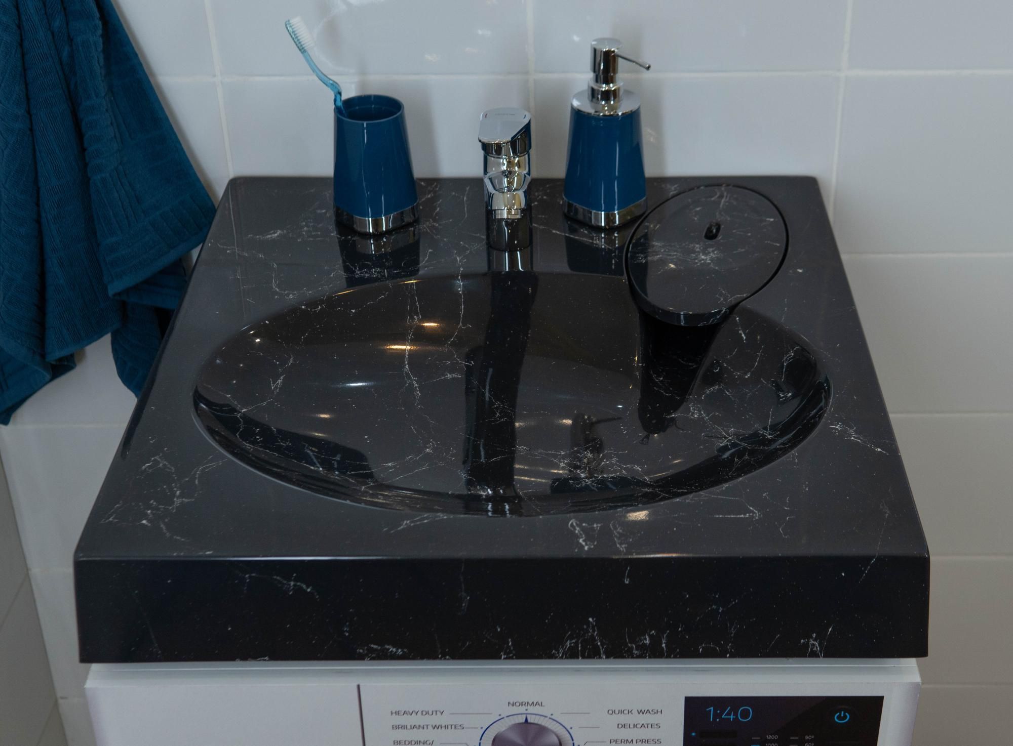 Раковина в ванную комнату для установки над стиральной машинкой. Крепится на кронштейны, которые входят в комплект поставки. Верхний слой высококачественного гелькоута образует декоративно-защитное покрытие. Изысканный цвет мрамора украсит любую ванную комнату.