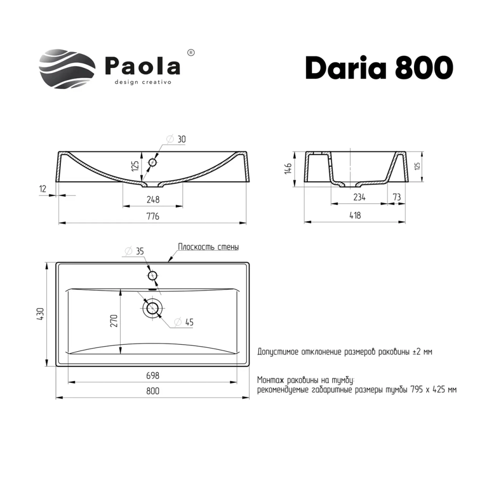 Врезная раковина Paola Daria 800 c возможностью установки на тумбу вровень или на столешницу. Современная, стильная, эргономичная. Раковина выполнена из прочного износостойкого литьевого мрамора, сверху покрыта специальным защитным покрытием гелькоутом. Исполнение поверхности Glossy Shine - изделие обладает глянцевым блеском, очень приятное на ощупь и даже при минимальном уходе сохраняет безупречный цвет и внешний вид на долгие годы. В комплекте слив-перелив, технический паспорт и гарантийный талон. Заводская гарантия составляет 5 лет, срок службы более 10 лет.