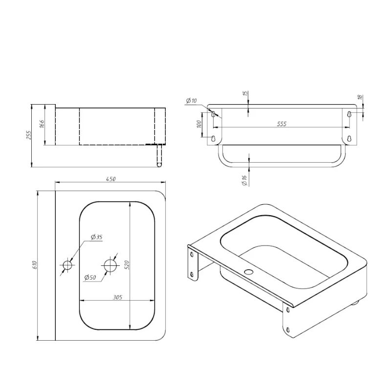 Раковина прямоугольная антивандальная Армия 1,2. Раковина из нержавеющей стали AISI 304. Поверхность раковины шлифованная, матовая. Прямоугольная форма удобна для установки нескольких раковин в один ряд. Толщина стали 1,2 мм.