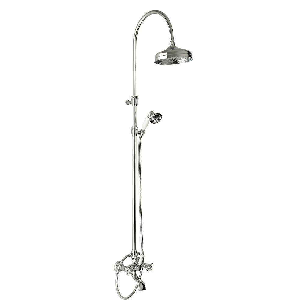 В состав входит: смеситель с изливом, шланг 150 см, лейка, верхний душ диаметром 20 см, колонна с держателем для лейки. |