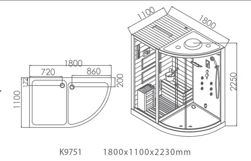 Комплектация: Г/М 8 форсунок, полочка, ручной душ, тропический душ, верхнее освещение, кадушка, черпак, песочные часы, гигротермограф, камни, деревянная скамейка. Печь-каменка с электронной регулировкой температуры.