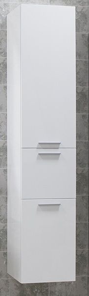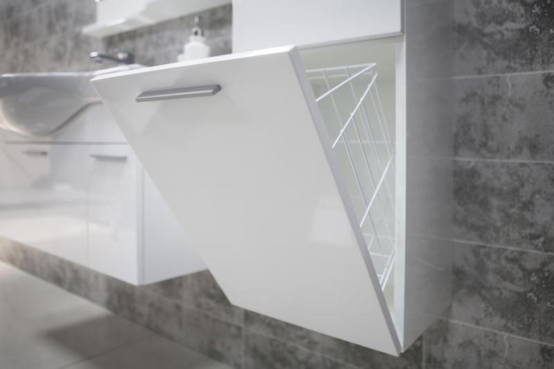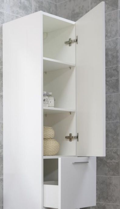Универсальный шкаф-колонна Акватон Инди 34 цвета белый глянец , с большим выдвижным ящиком и фасадом-створкой в верхней части, с бельевой корзиной, открывается в левую или в правую сторону