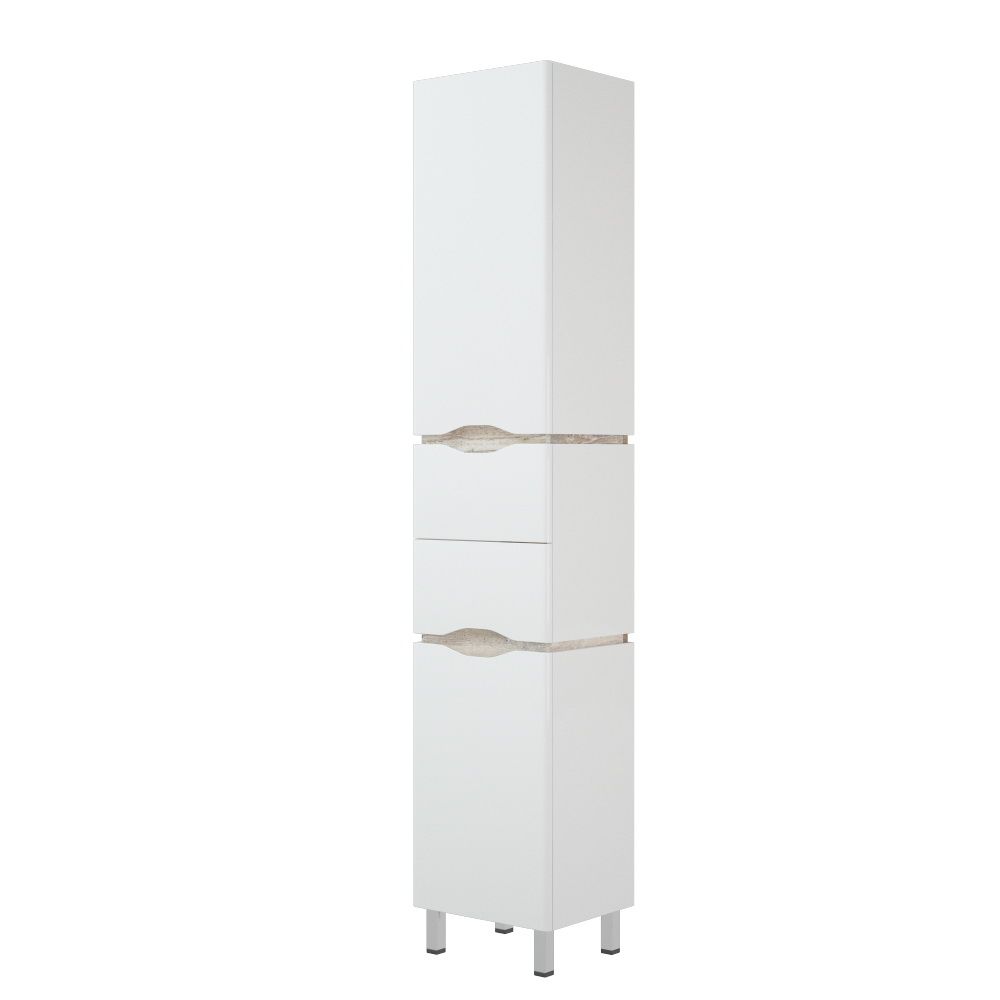 У пенала "Бостон" сверху расположена 1 распашная дверь, позади которой - вкладная полка. Ниже 2 выдвижных ящика на направляющих скрытого монтажа с доводчиком. Внизу - дверь с корзиной для белья. Все двери на петлях с доводчиками. Особенностью пенала являеется наличие "двойных боковин". Внутренние боковины из ЛДСП, внешние из ЛДСП, покрашенного в глянцевую белую эмаль. У пенала 4 металлических опоры. Фасады - МДФ с белой глянцевой эмалью.