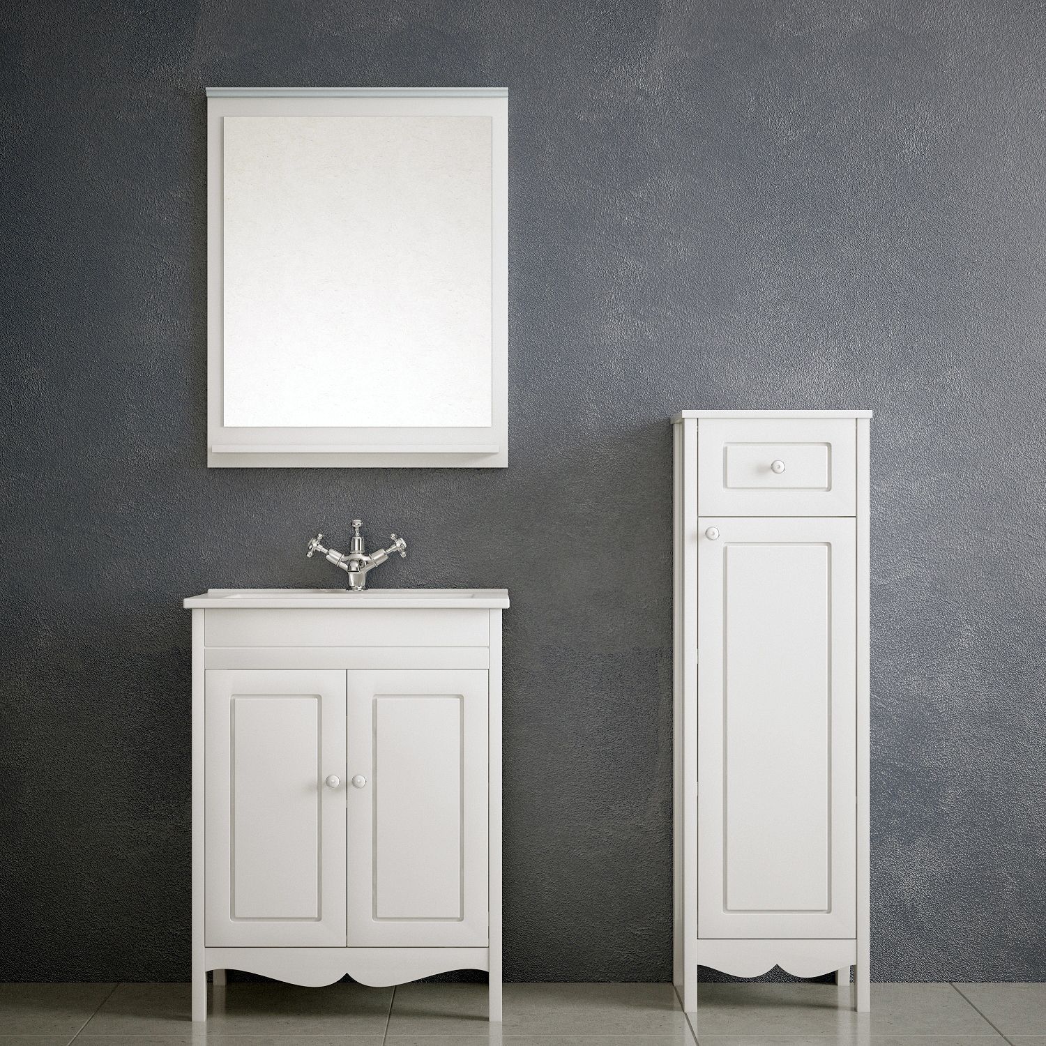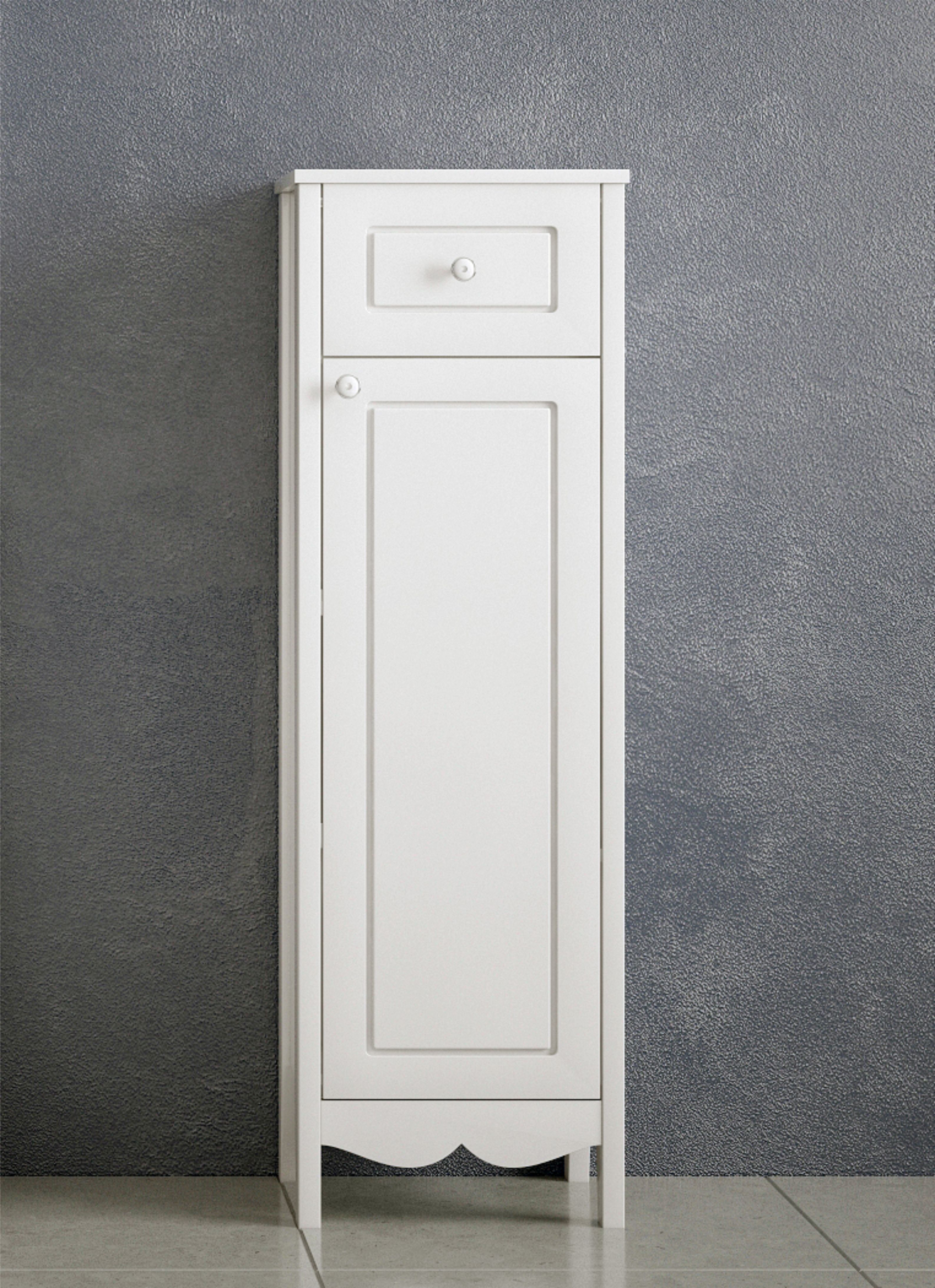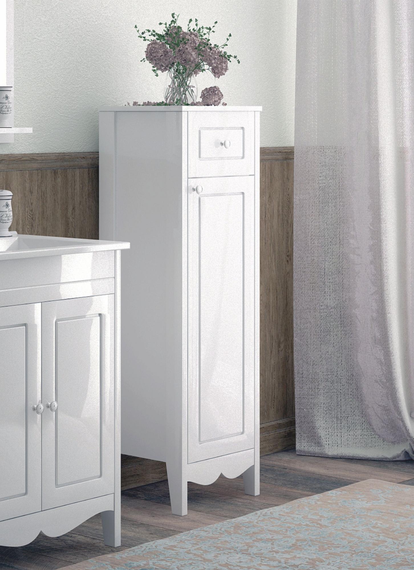 У пенала 1 распашная дверь с фрезеровкой. Петли на двери с доводчиком. Позади дверей 2 вкладные полки. Выдвижной ящик. Белая глянцевая эмаль.