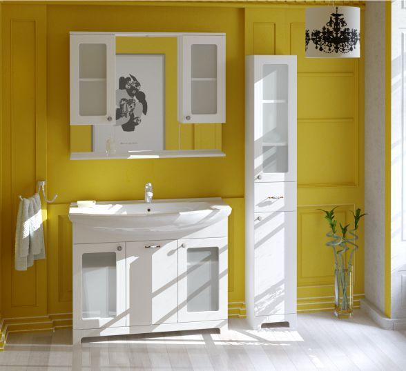 У пенала 2 распашные двери. Петли с доводчиками. Верхняя дверь имеет сквозную фрезеровку и матовое зеркало. Позади дверей есть регулируемые по высоте вкладные полки. По центру расположен выдижной ящик. Эмаль - белая глянцевая.