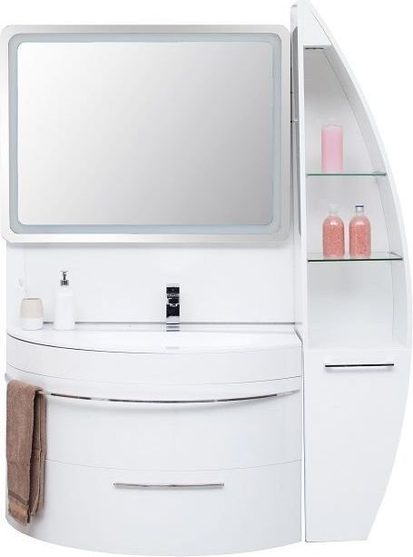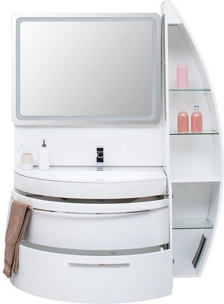 Шкаф-пенал De Aqua Эскалада RS0 R белого цвета преобразит угол ванной комнаты, заполнив интерьер округлостью форм и предлагая по-иному взглянуть на привычное пространство. Его асимметричная форма, напоминающая разрезанный напополам полукруг, привнесет элементы абстракции в привычное видение дизайна помещения. В комплекте с левосторонней тумбой из этой же коллекции этот подвесной шкаф-пенал, в котором предусмотрена правосторонняя установка, составит единое изделие, поражающее своей эксцентричностью и расширяя возможности комплекта. Тем более что глубина тумбы и шкафа идентичны - 350 мм, так что составление из него единого изделия не составит труда. Несмотря на непривычную форму, пенал довольно вместительный и позволит разместить в нем много полезных для ванной комнаты вещей. Стеклянные полочки в верхней части шкафа - открытые, и на них можно поставить то, что пользуется в ванной комнате повышенным спросом, скажем, парфюмерию, косметику и средства для принятия ванны. Нижние полки скрыты за распашными дверцами, которые снабжены механизмом доводчика, что добавит комфорта в использование шкафа-пенала. Мебель De Aqua может быть изготовлена в любом цвете или в шпоне по индивидуальному заказу.