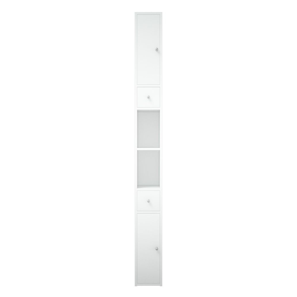 У пенала 2 распашные двери, позади полки. Есть 2 выдвижных ящика на шариковых направляющих. Высота ящиков 110 мм. Все двери на петлях с доводчиками. По центру пенала есть ниша, разделенная на 2 части полкой. Пенал является универсальным, то есть может быть установлен как правым, так и левым, путем переворачивания.