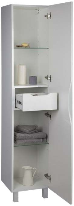 Шкаф-пенал Iddis Custo 36 CUS40W0i97 с двумя ножками, с распашной дверцей и внутренним выдвижным ящиком. Предназначен для использования в ванных комнатах с повышенной влажностью. Влагостойкие материалы повышенной плотности. Высококачественные немецкие петли с доводчиками плавно и бесшумно закрывают дверцу.