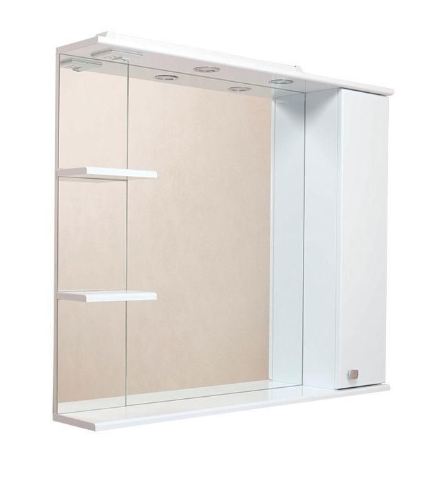 Современный функционал шкафа позволяет удобно расположить все необходимое: справа от зеркала за распашной дверцей с механизмом плавного закрывания расположено отделение для хранения, разделенное на три части горизонтальными полочками, слева и внизу под зеркалом - открытые полочки для косметических средств или декоративных элементов.