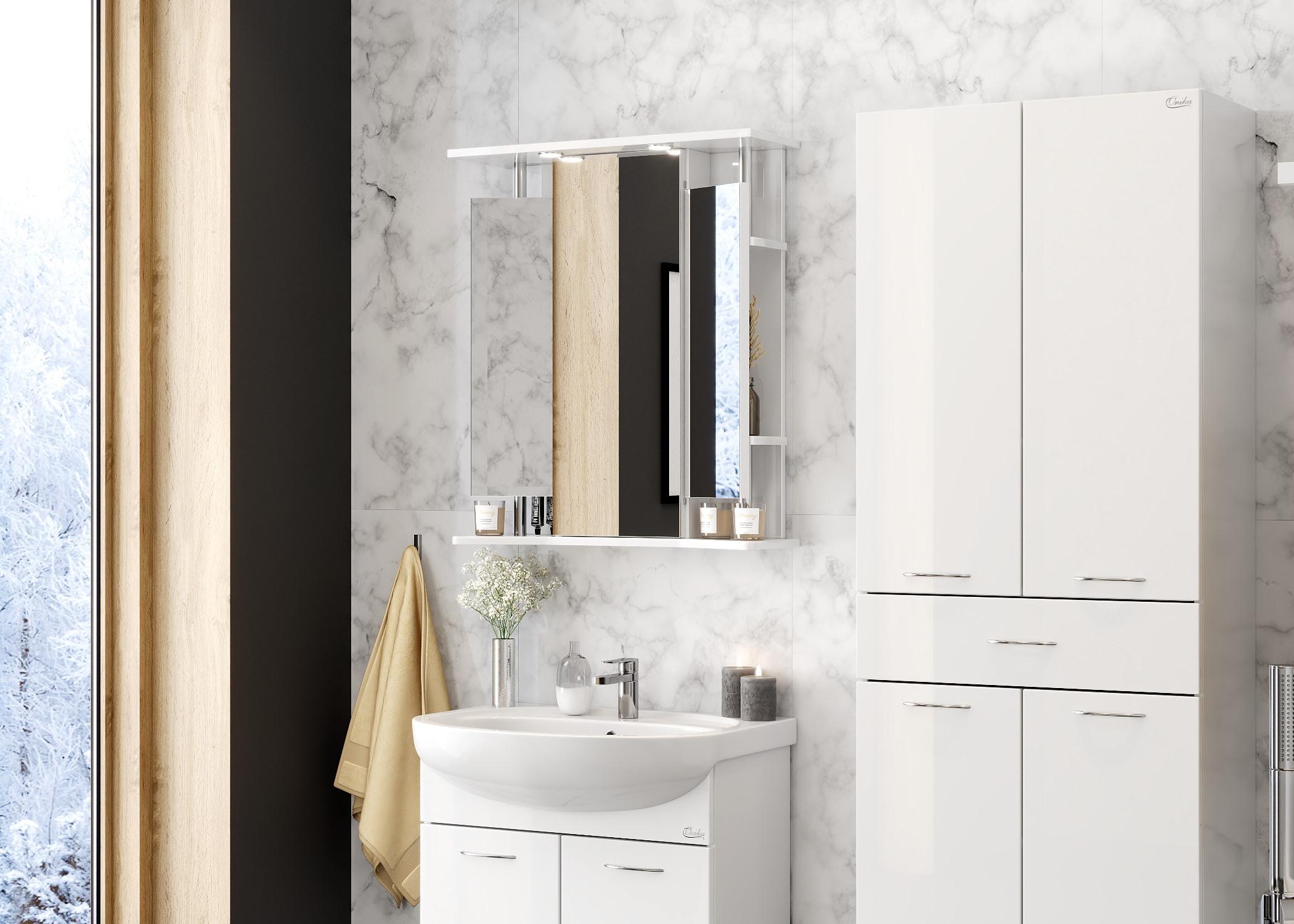 Неординарный дизайн и обилие разнообразного пространства для хранения - отличительная особенность зеркального шкафа Onika ВАЛЕРИЯ 65.