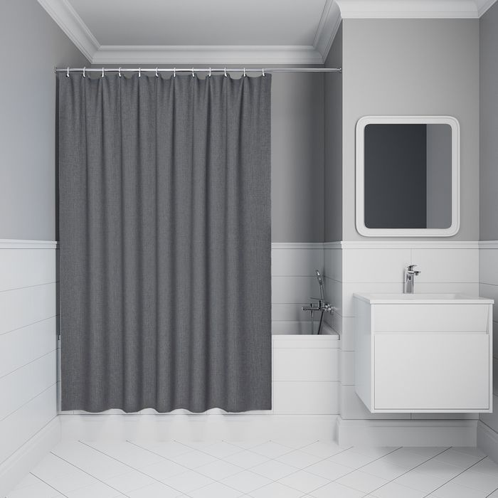 Однотонная плотная текстильная штора для ванной насыщенного серого цвета с фактурой натурального льна, что делает ее элегантной и утонченной. Напоминает классические текстильные шторы и соответствует актуальному тренду оформления ванной как уютной жилой комнаты.