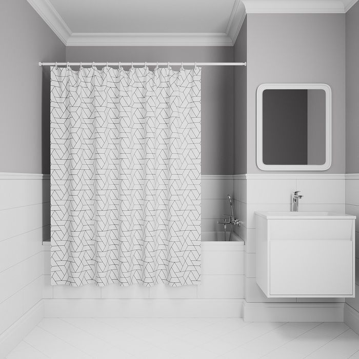 Текстильная штора для ванной белого цвета с черным геометричным принтом.