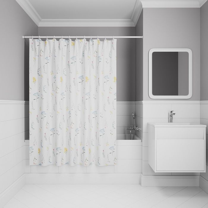 Текстильная штора для ванной белого цвета с красивым растительным узором из полевых цветов.