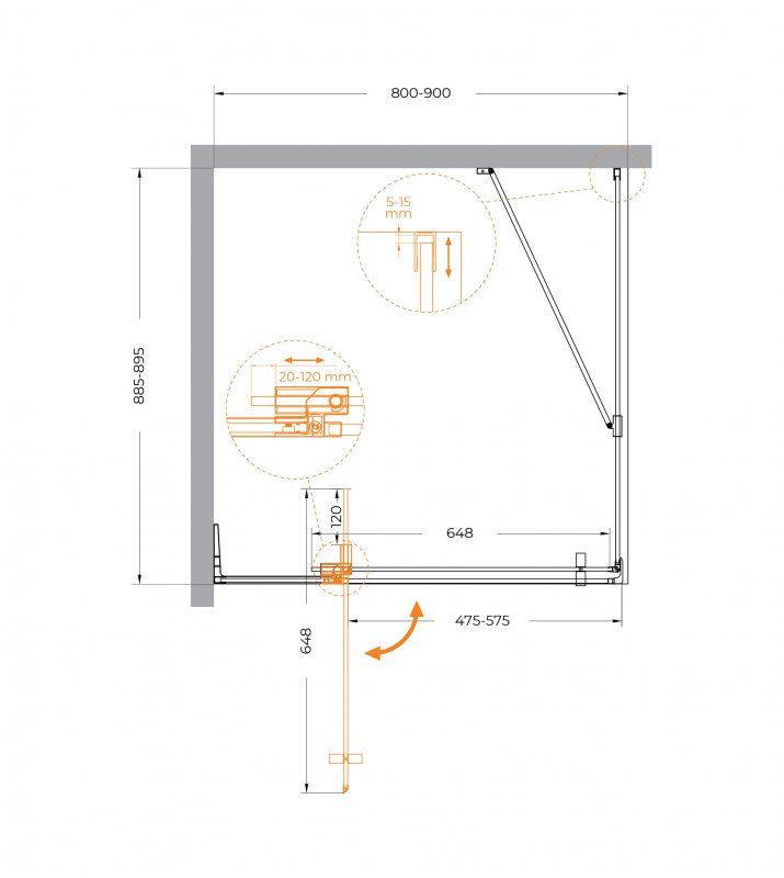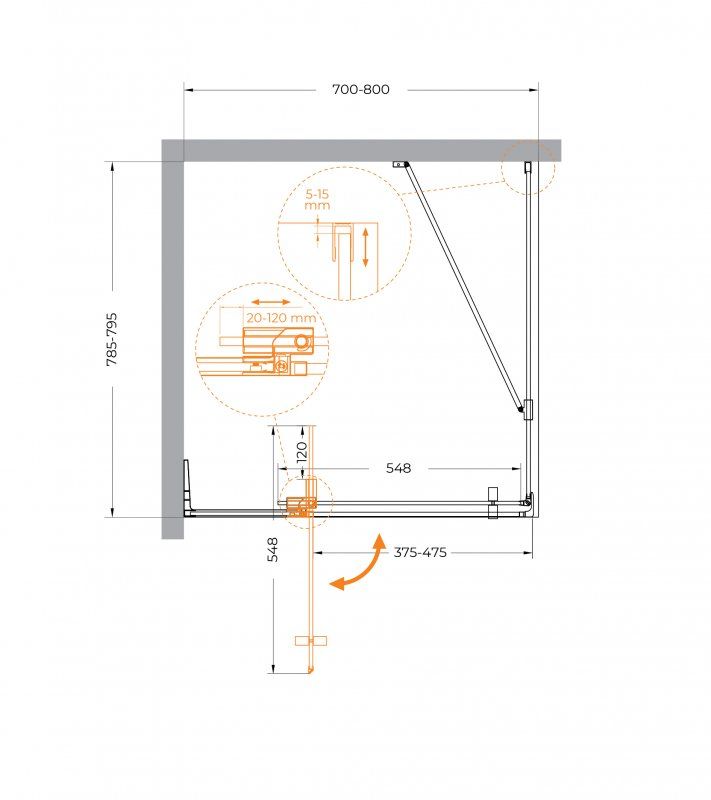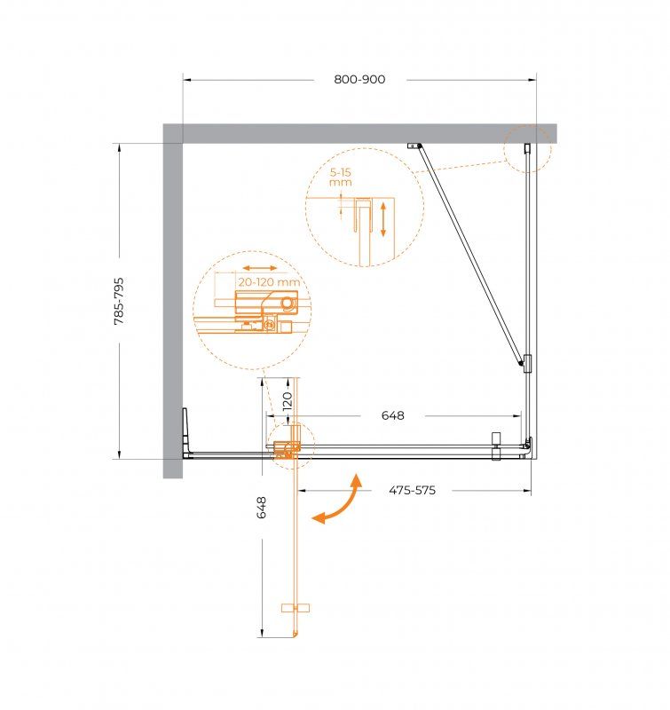 ОБРАТИТЕ ВНИМАНИЕ: конструкция петли позволяет регулировать ширину входа душевого ограждения в диапазоне 10 см.